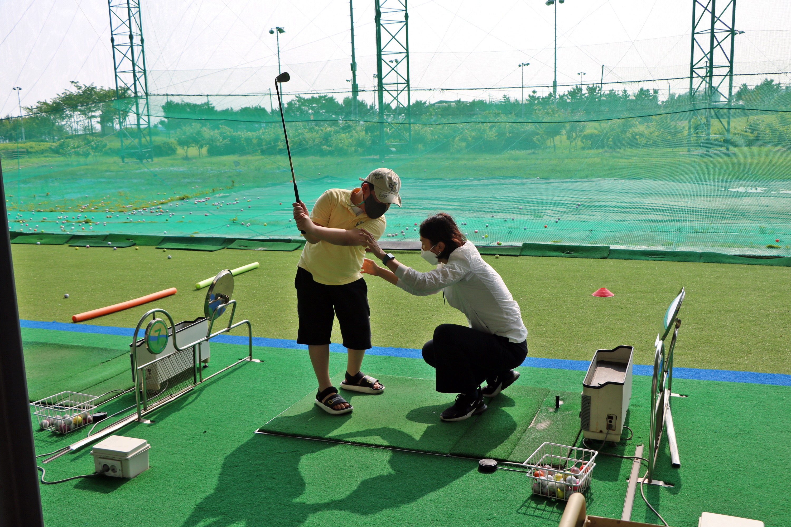 스윙이 무너지지 않도록 톱스윙 자세를 다시 한번 꼼꼼히 교정해 주고 있는 모습