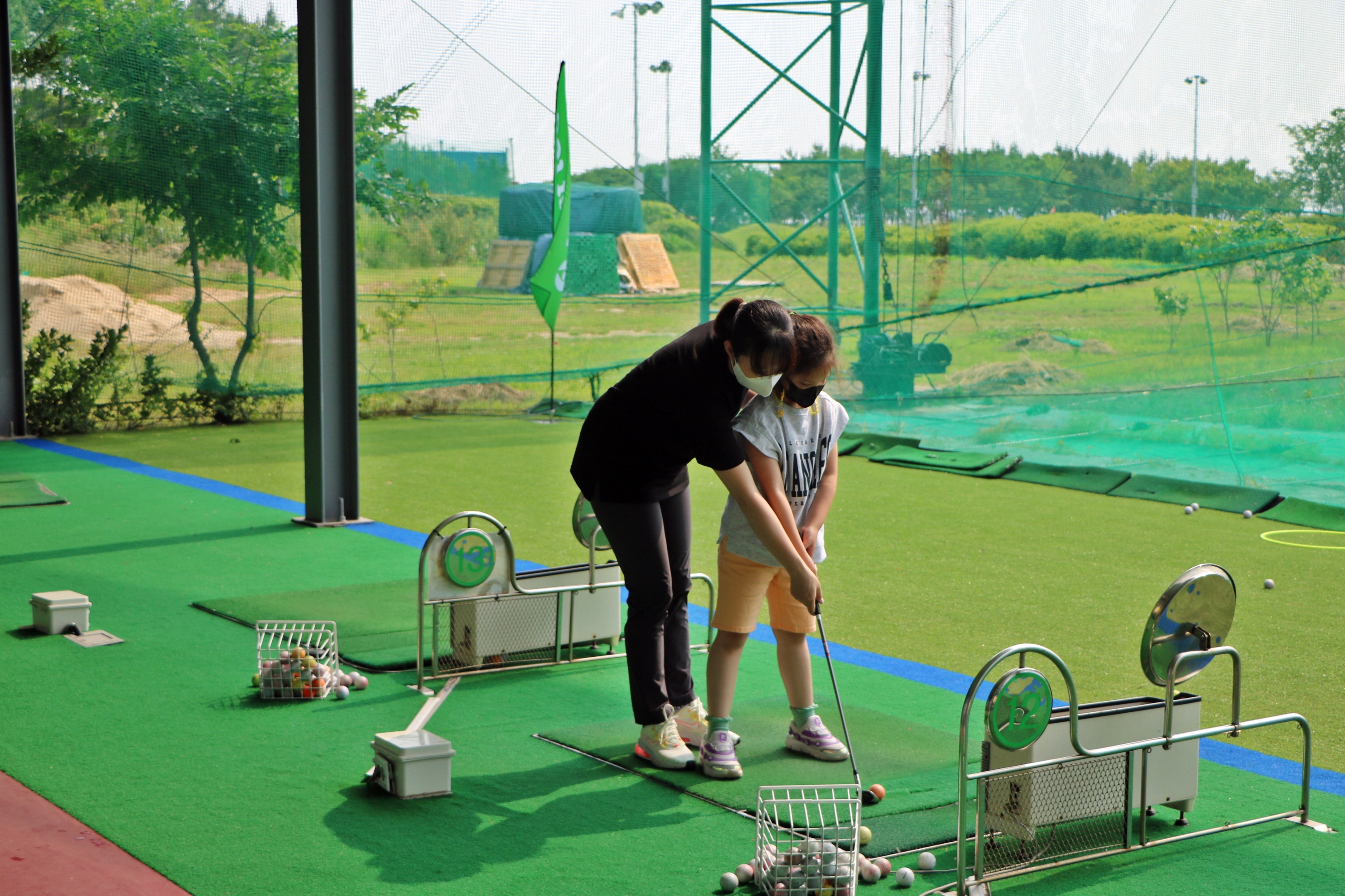 볼의 위치와 함께 어드레스 동작을 교정해주고 있는 코치님