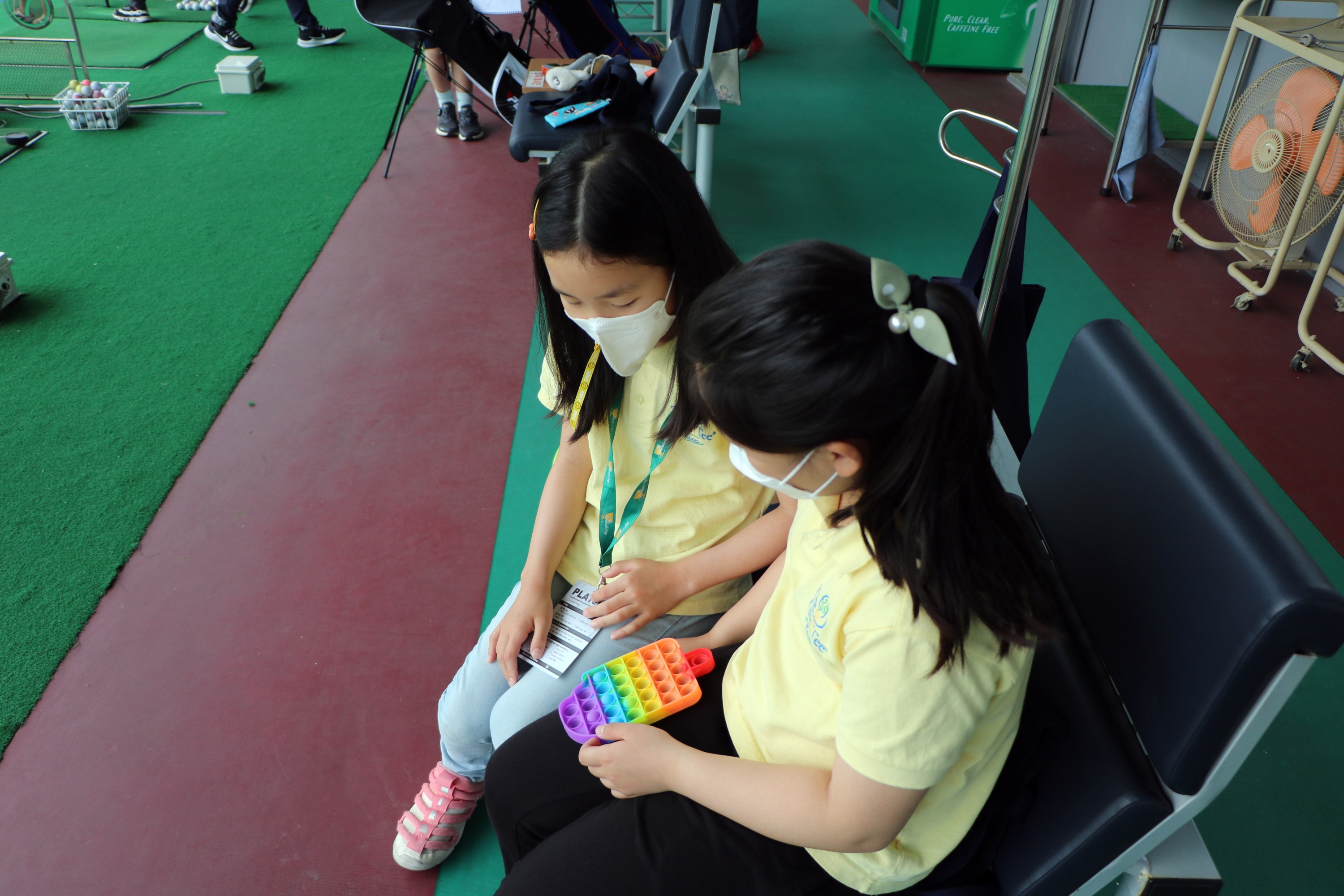 잠시 막간을 이용해 친구와 게임을 하며 자신의 스윙 순서를 기다리고 있는 모습