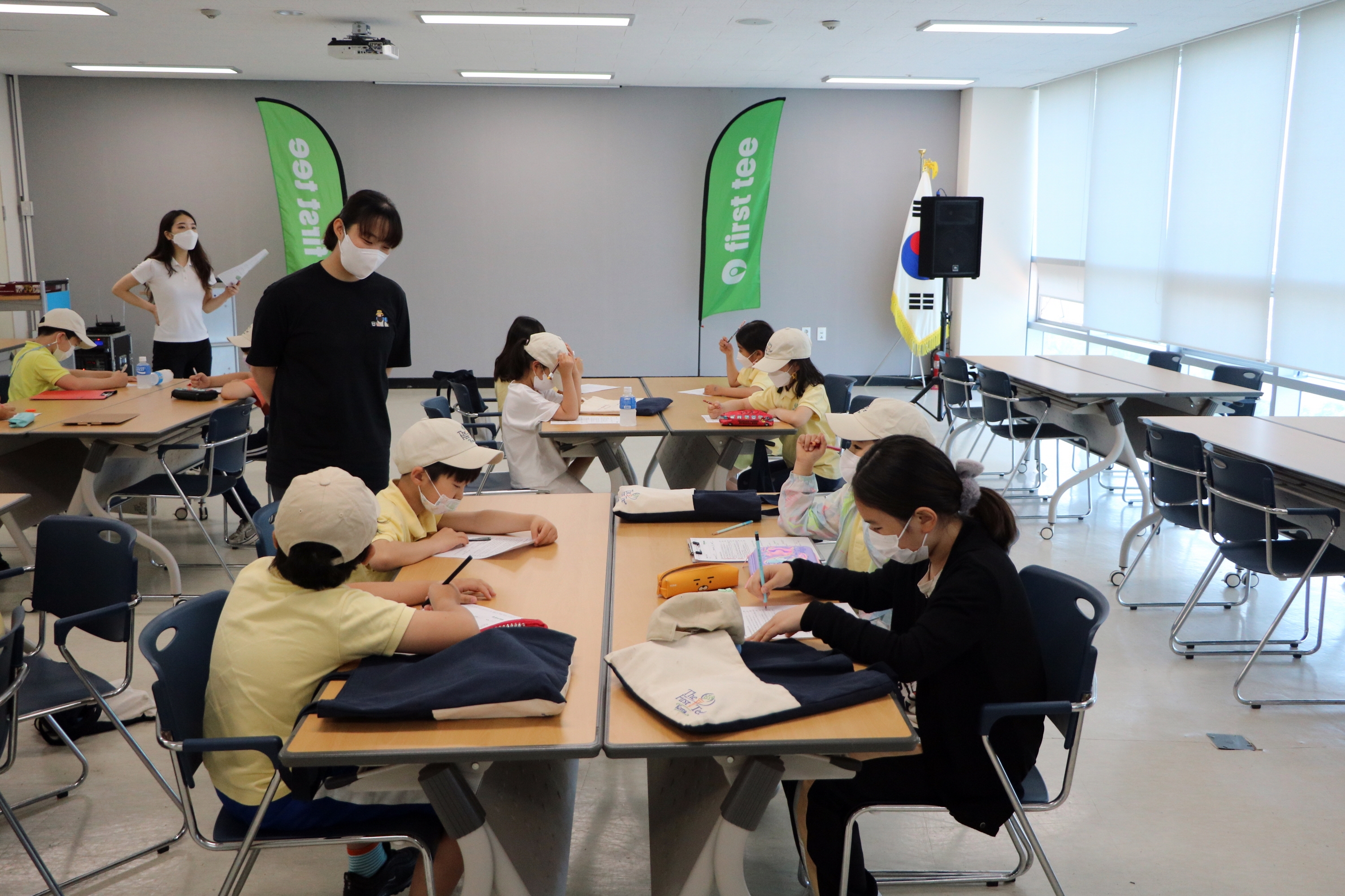 코치님과 함께 정직을 실천하며 자신이 푼 문제지의 답을 맞추고 있는 아이들