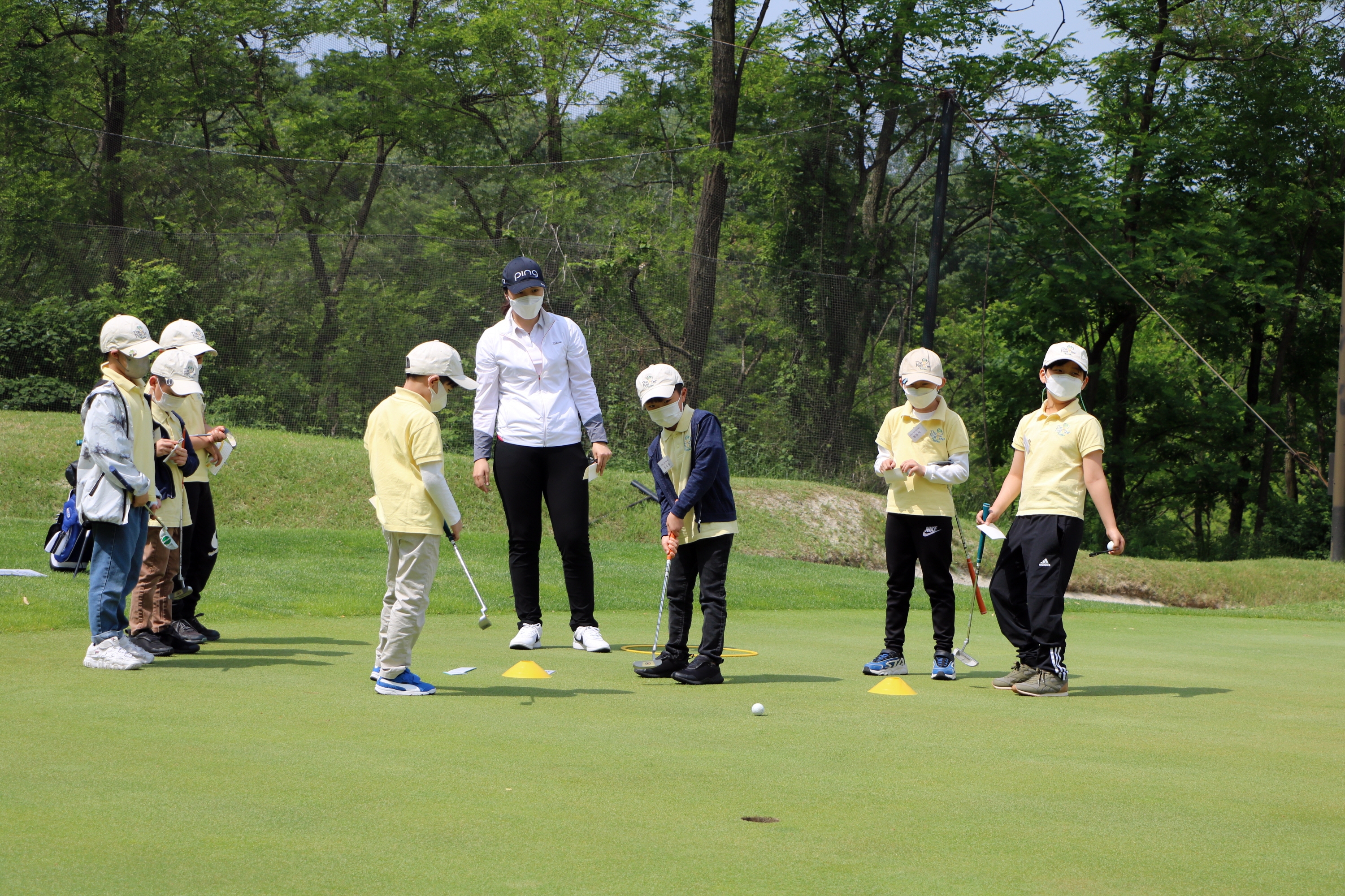 조별로 코치님이 지켜보는 가운데 9홀 퍼팅 라운드를 하고 있는 모습