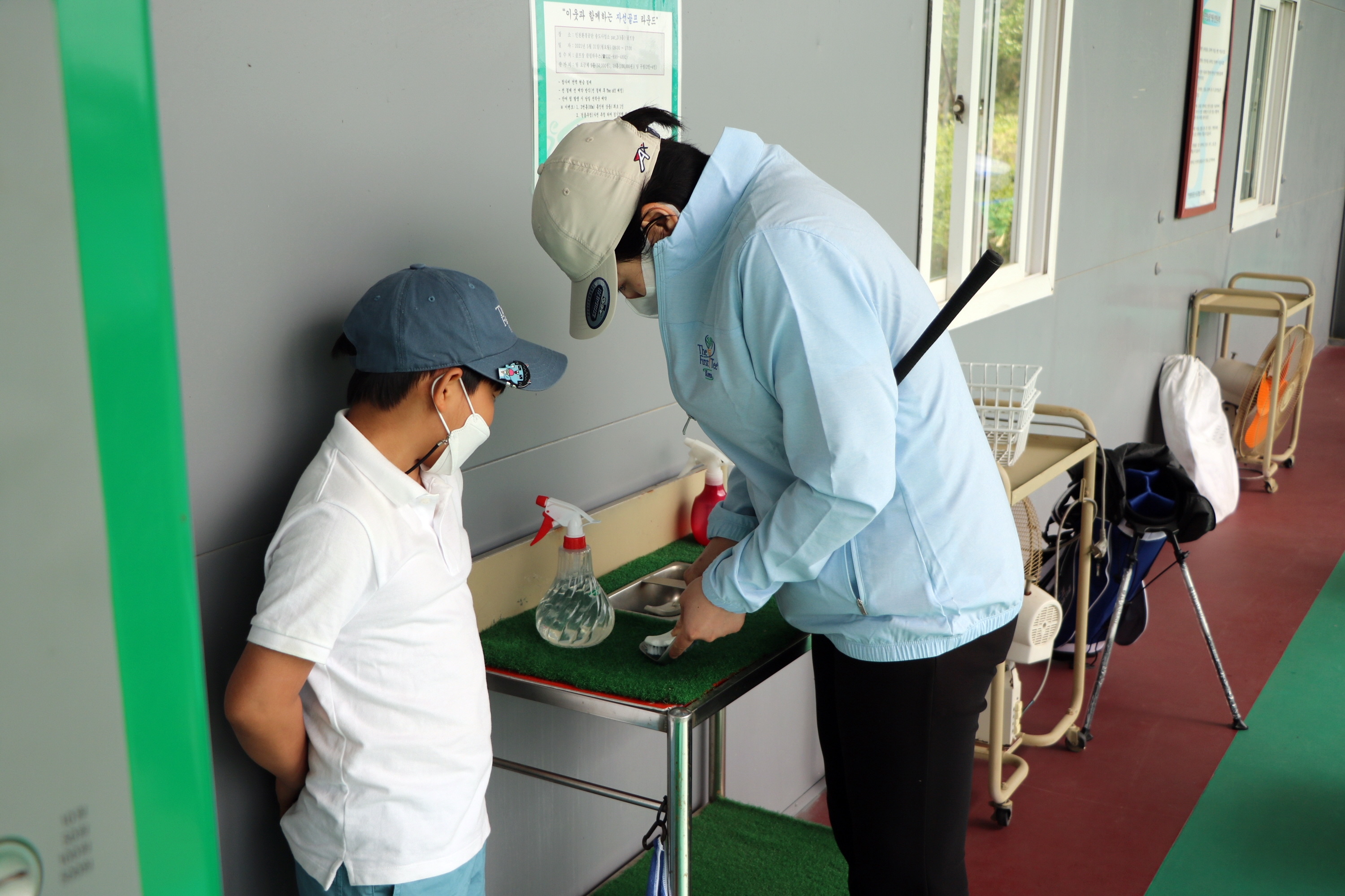 골프클럽은 자신의 몸처럼 깨끗하게 유지해야 한다면서 직접 클럽 세척법을 알려주고 계신 모습