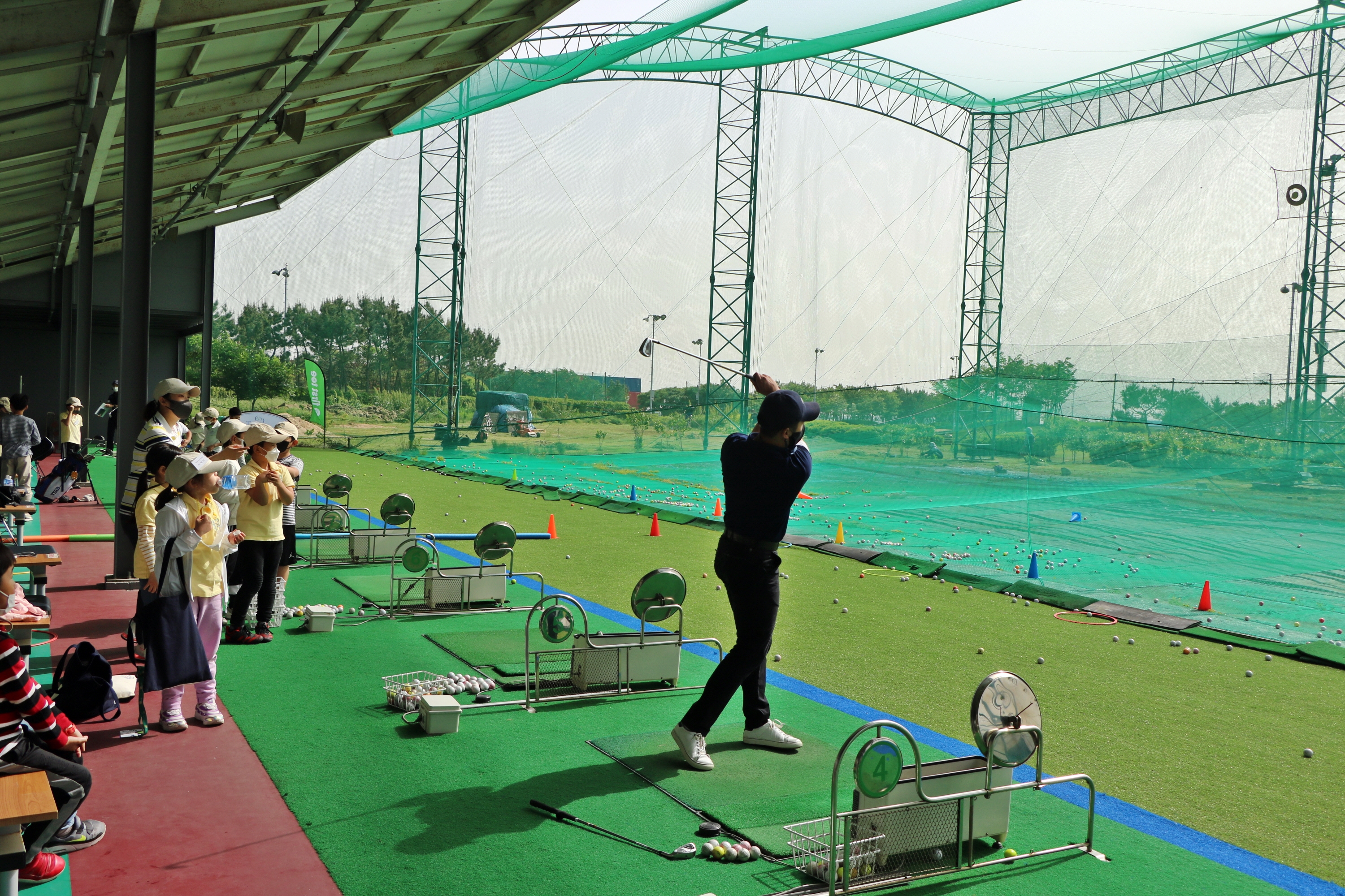 아이들에게 올바른 골프스윙 동작을 직접 시범으로 보여주며 설명해주고 있는 코치님
