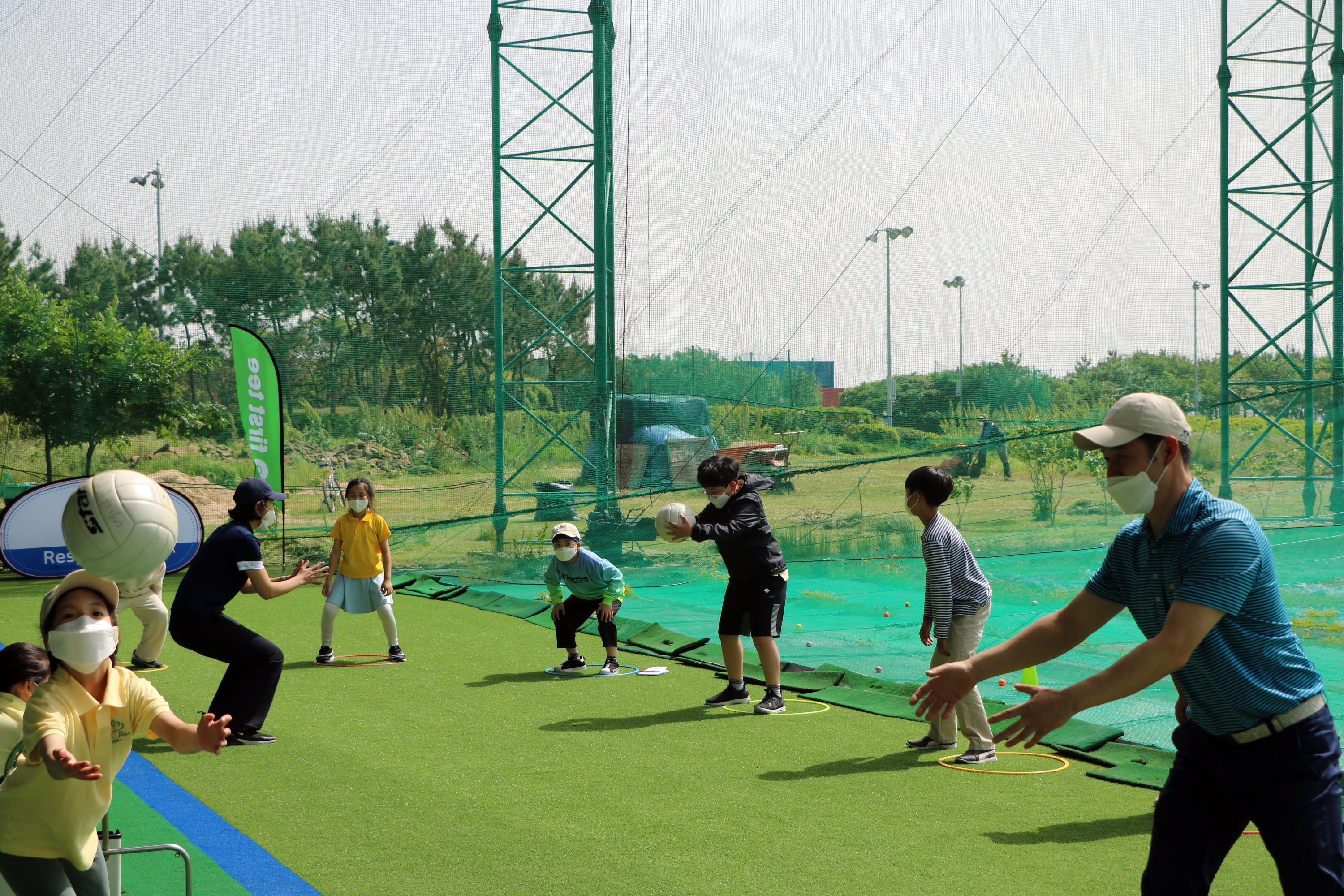 시계방향으로 돌아가면서 스쿼트 자세로 옆사람에게 배구공을 전달받은 뒤 제자리 점프를 하며 몸을 풀고 있는 아이들