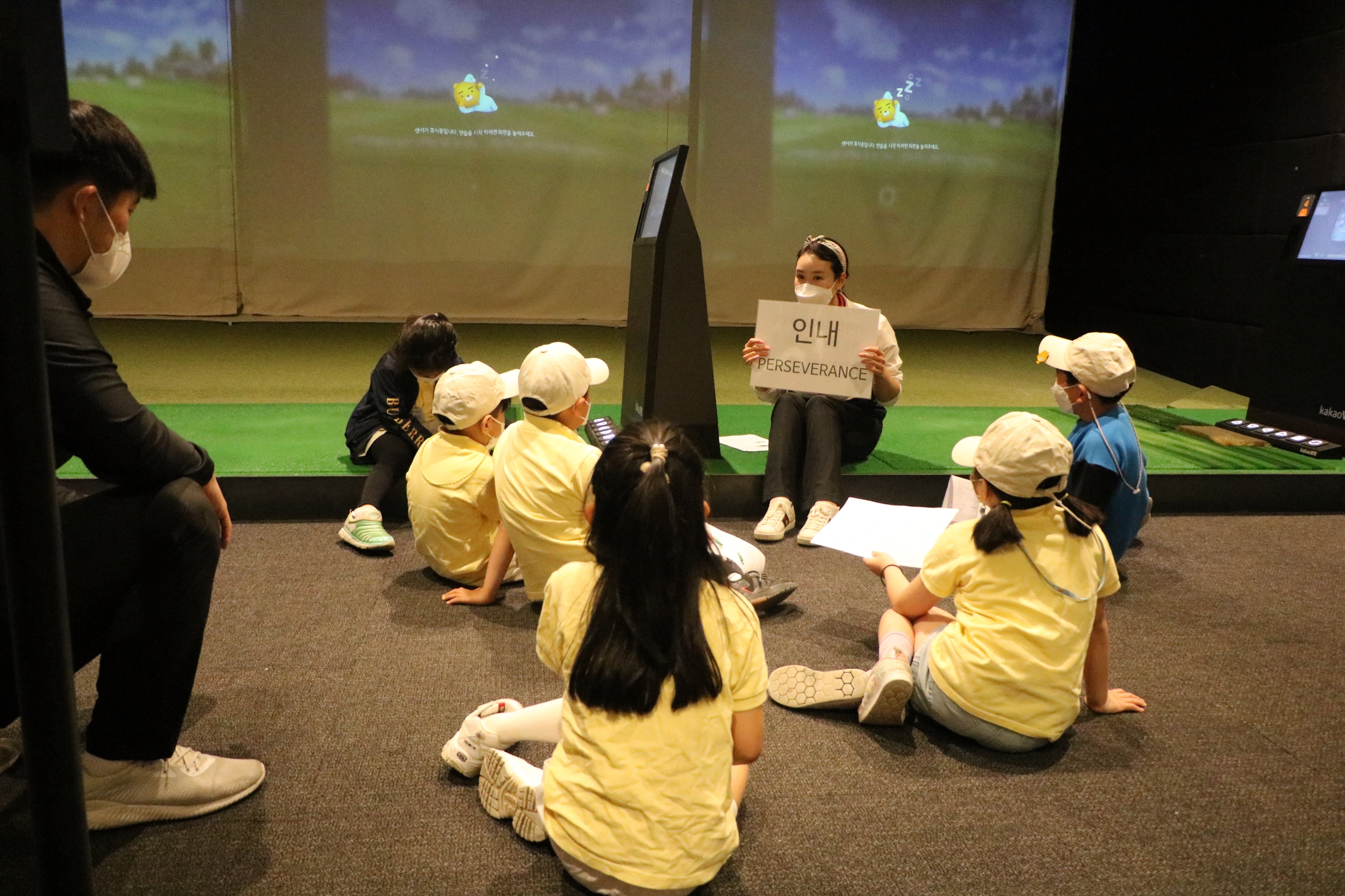 오늘 수업의 주제인 골프할 때 지켜야 할 인내에 대해서 설명 중인 모습
