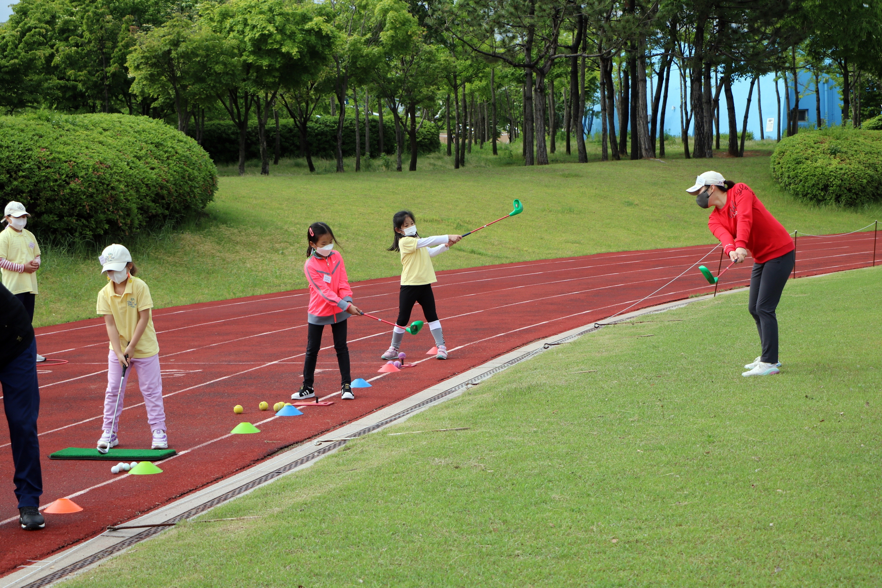 코치님을 따라 Y TO Y 스윙을 반복적으로 연습하고 있는 아이들