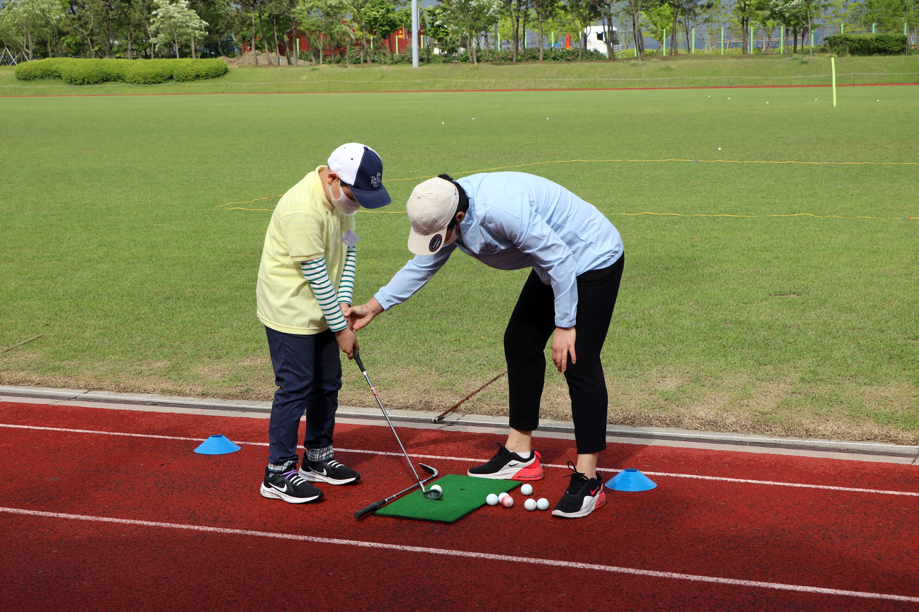 어드레스 시 정확한 볼의 위치와 손목 위치 등에 대해서 다시 한번 체크해 주고 있는 모습