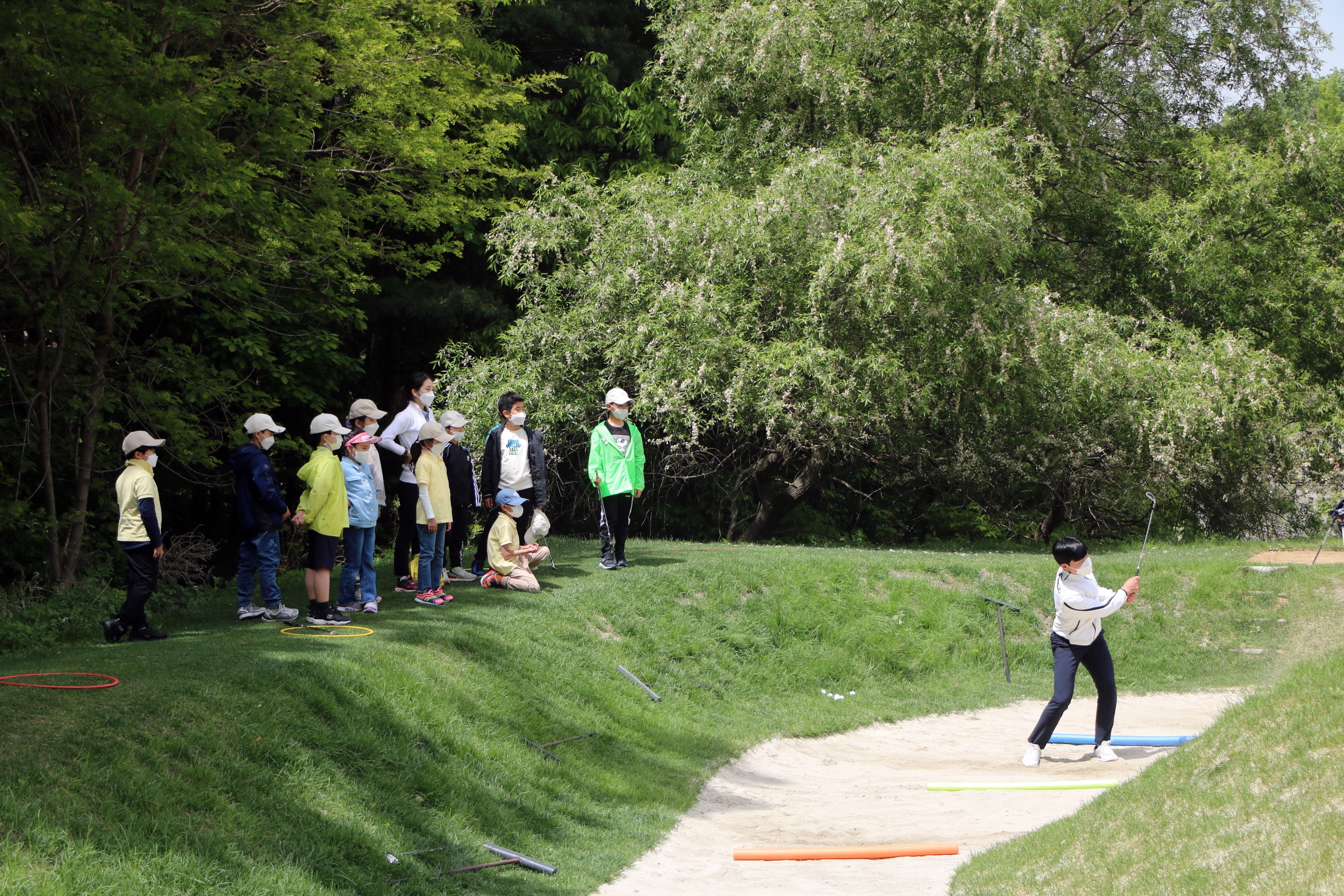 벙커샷 실습에 앞서 코치님의 시범을 지켜보고 있는 아이들