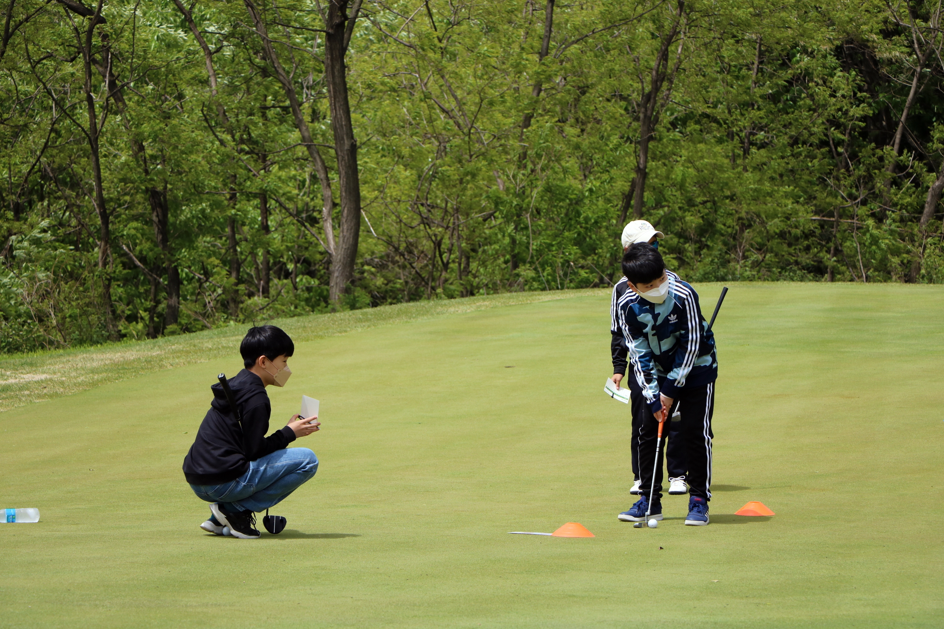 퍼트 라인을 살펴본 뒤 홀까지의 거리를 정확하게 계산 하고 있는 아이들