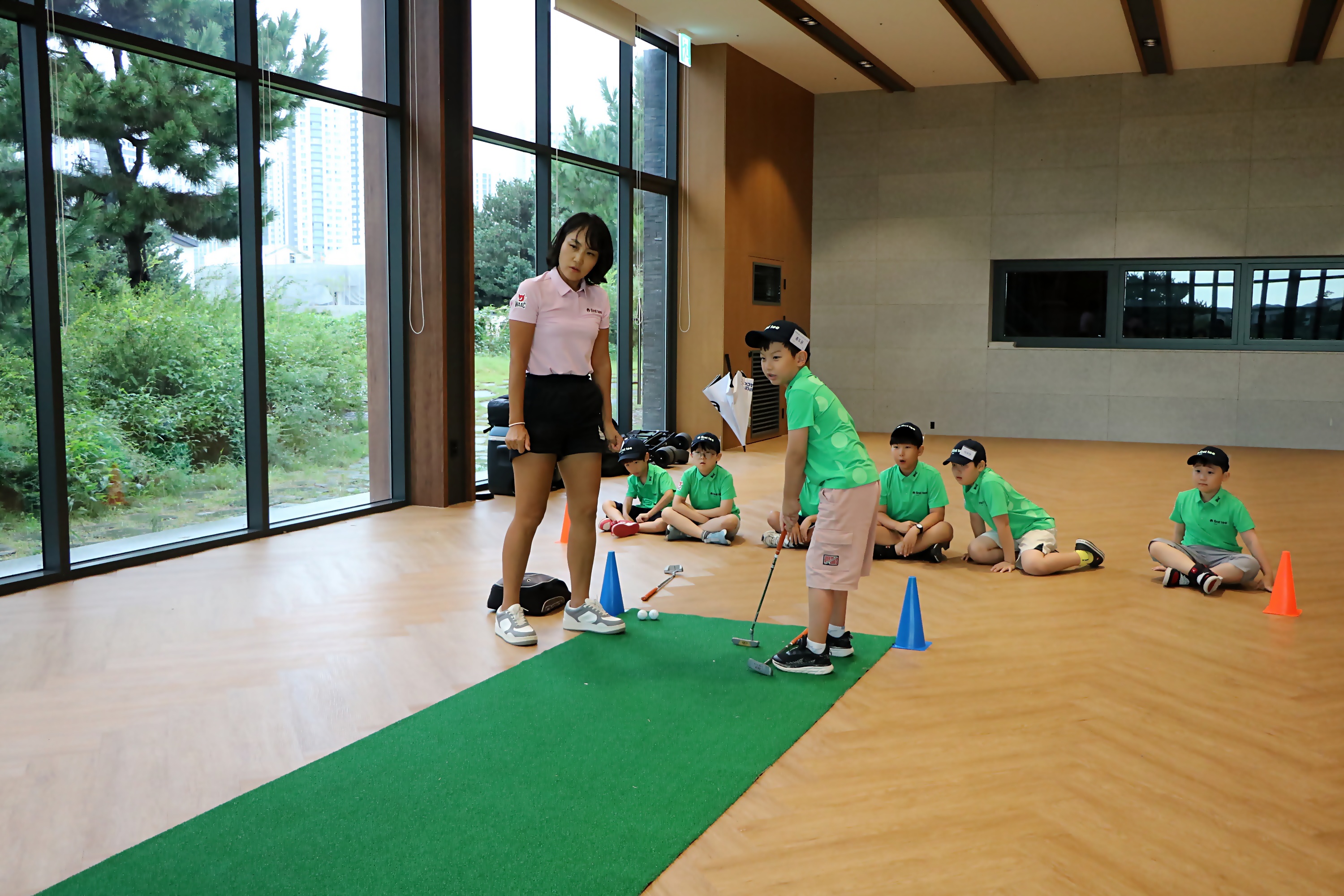 코치님의 지도 하에 순서대로 퍼팅 실습을 하고 있는 아이들
