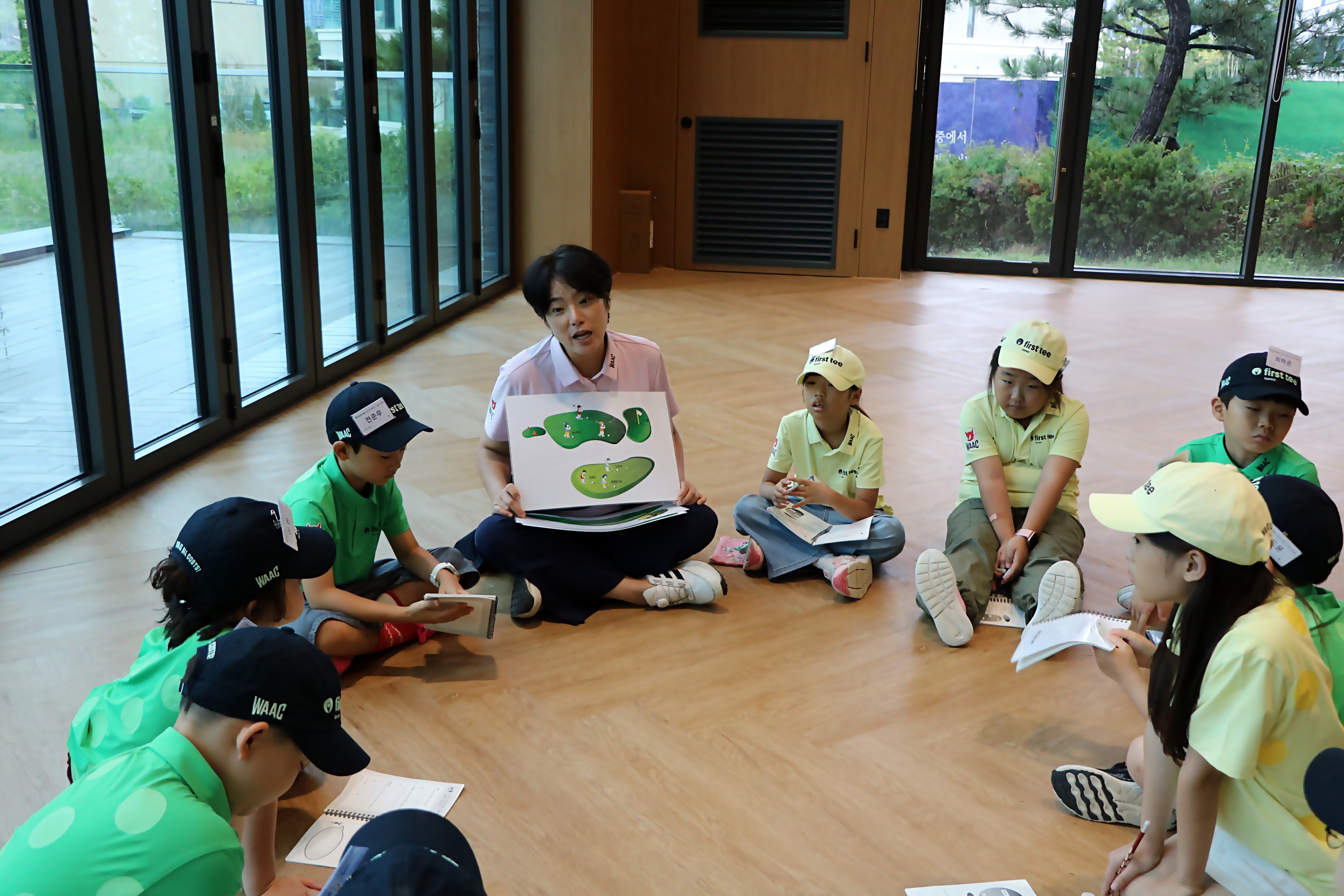 페어웨이나 그린 위에서 지켜야 할 원구선타 룰에 대해서 설명해 주고 있는 모습