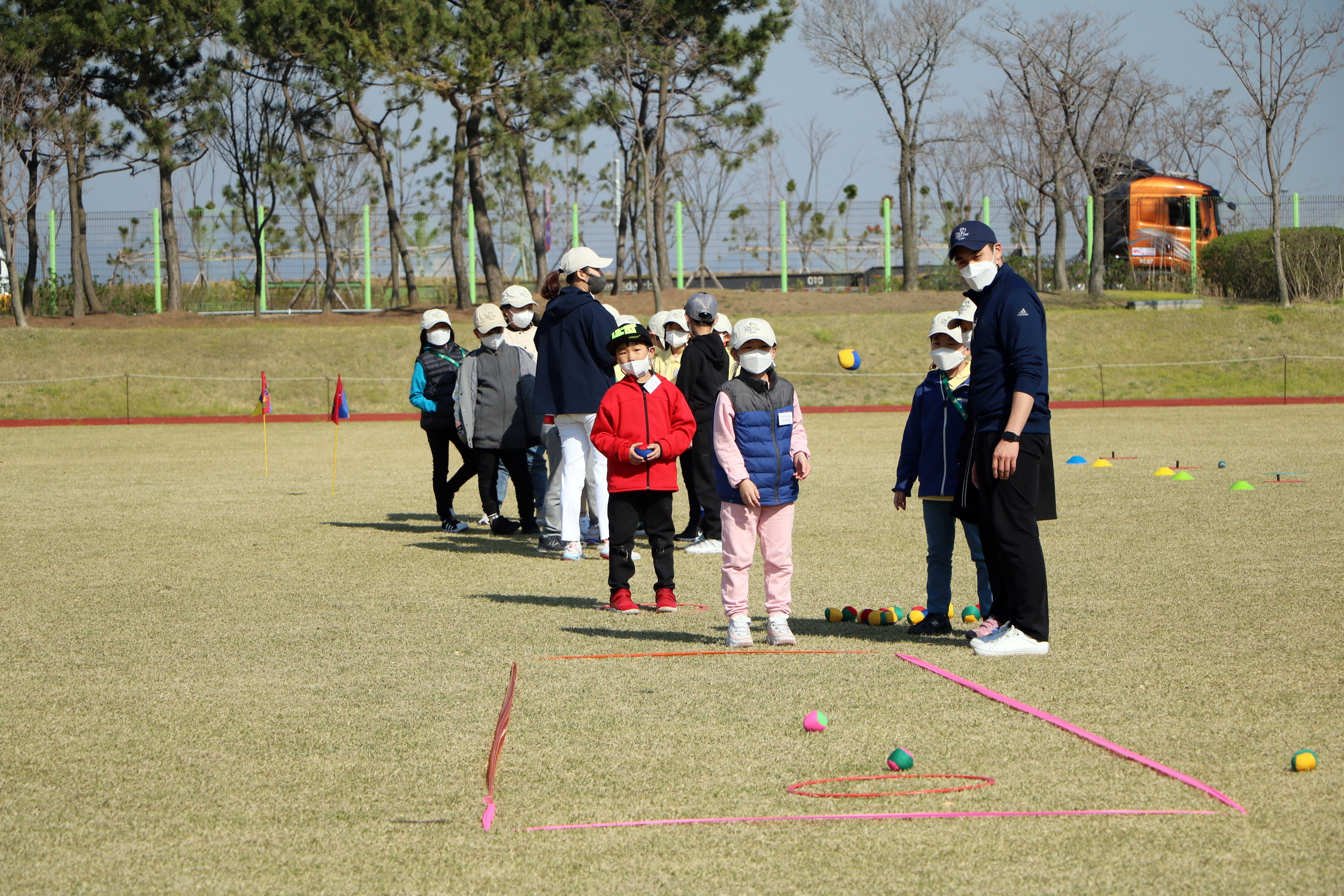 골프게임과 똑같은 방식으로 골프채 대신 손으로 공을 던져 원안에 넣는 게임을 하며 골프에 대한 개념을 익히고 있는 아이들