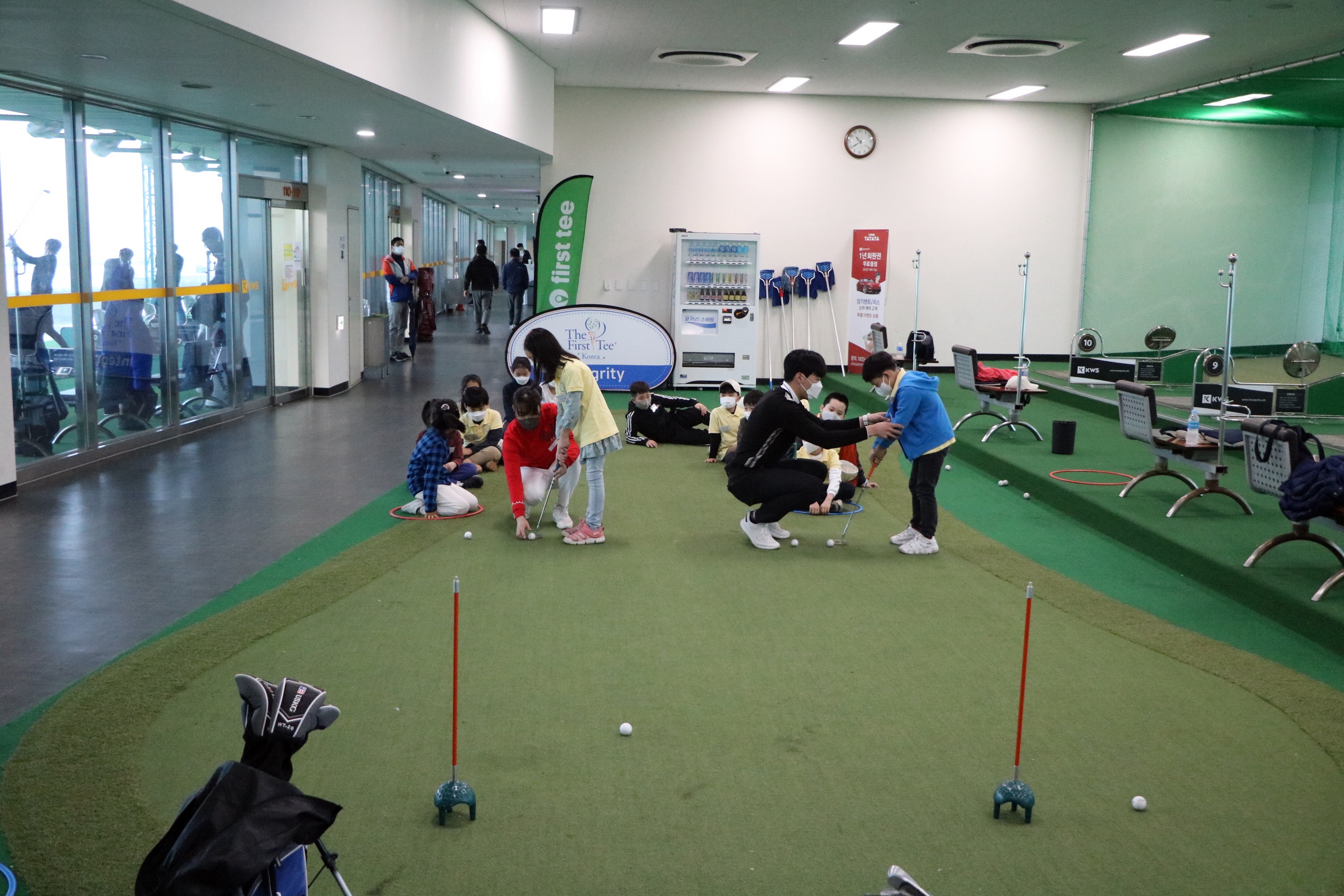 양팀으로 나뉘어 각자 레슨을 받으며 총 두번 연습한 후 세번째 퍼팅을 시도하여 승패를 가르는 퍼팅게임을 하고 있는 모습