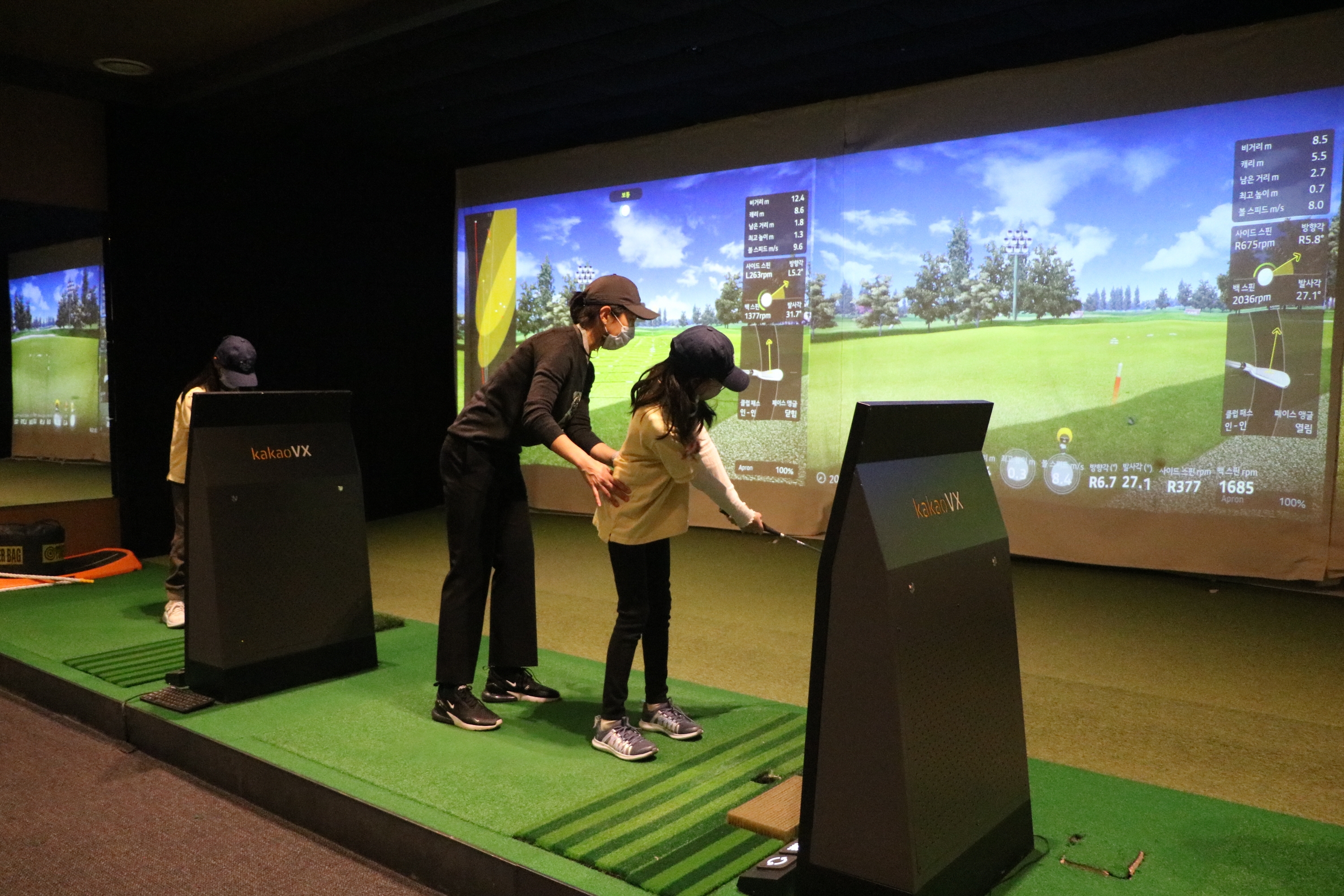 칩샷을 할 때는 왼발에 체중이 실려 있어야 한다고 가르쳐 주고 있는 모습