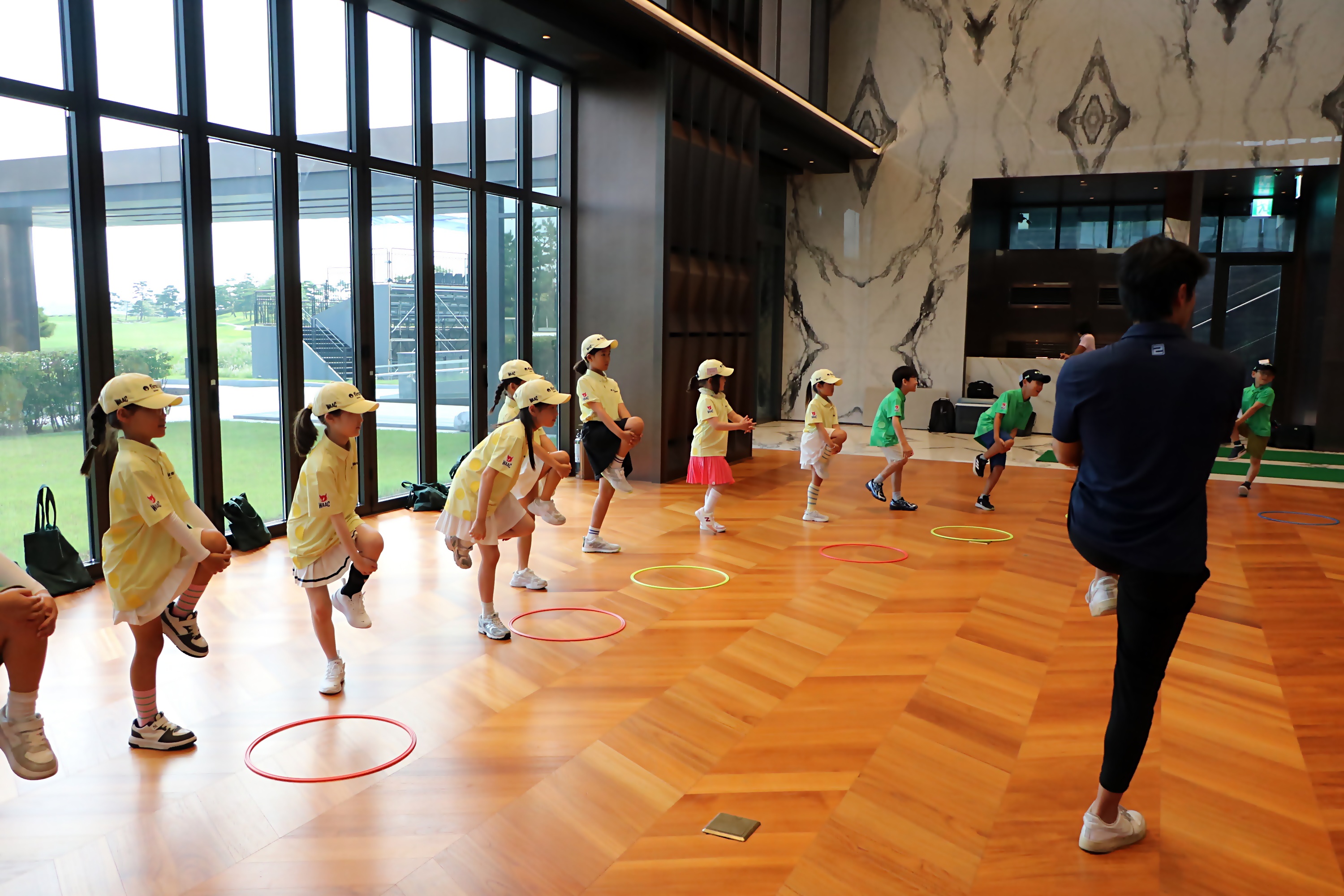 부상방지를 위해 코치님의 구령에 맞춰 스트레칭을 하고 있는 모습
