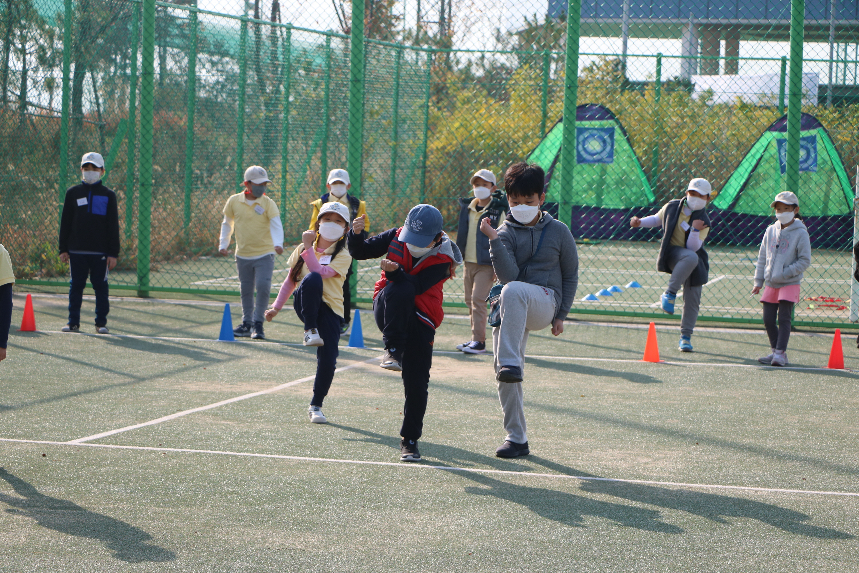 부상방지를 위해 골프실습에 앞서 신나게 몸풀기를 하고 있는 아이들