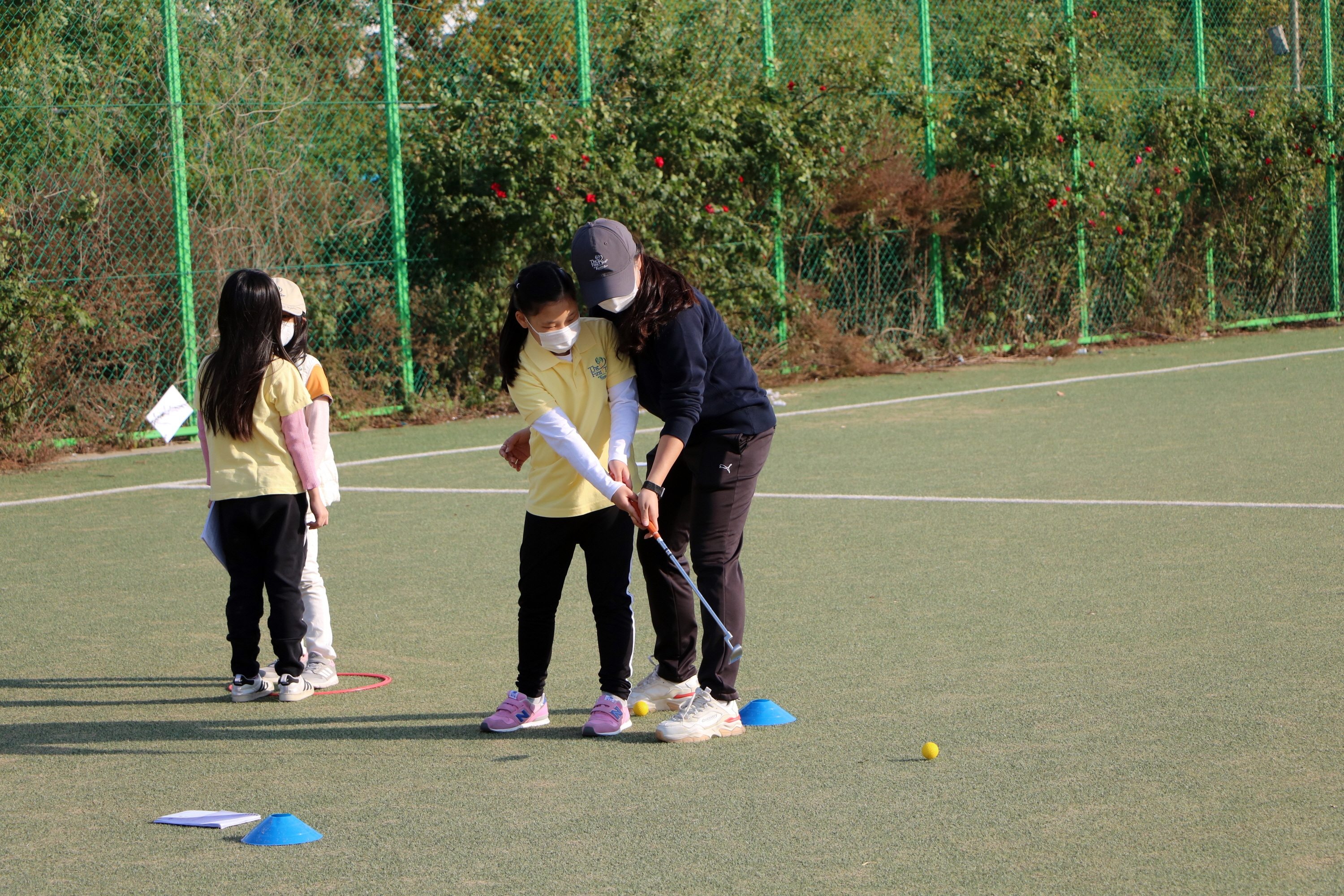 퍼팅게임 도중 중간중간 교육생들의 잘못된 부분을 교정해 주는 모습