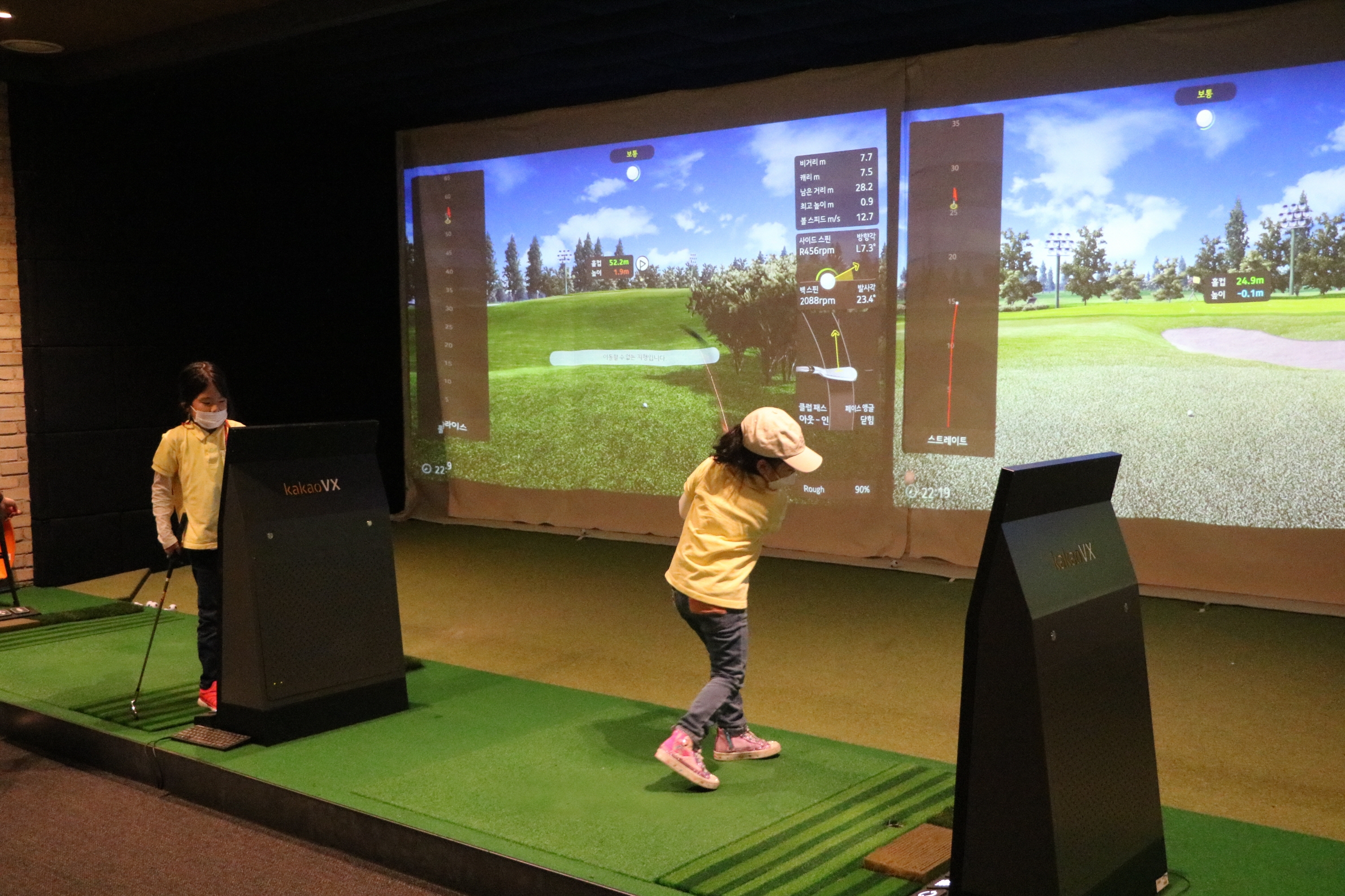 스윙의 크기에 따라 볼이 날아가는 거리가 달라지는 것을 직접 실습해 보고 있는 아이들