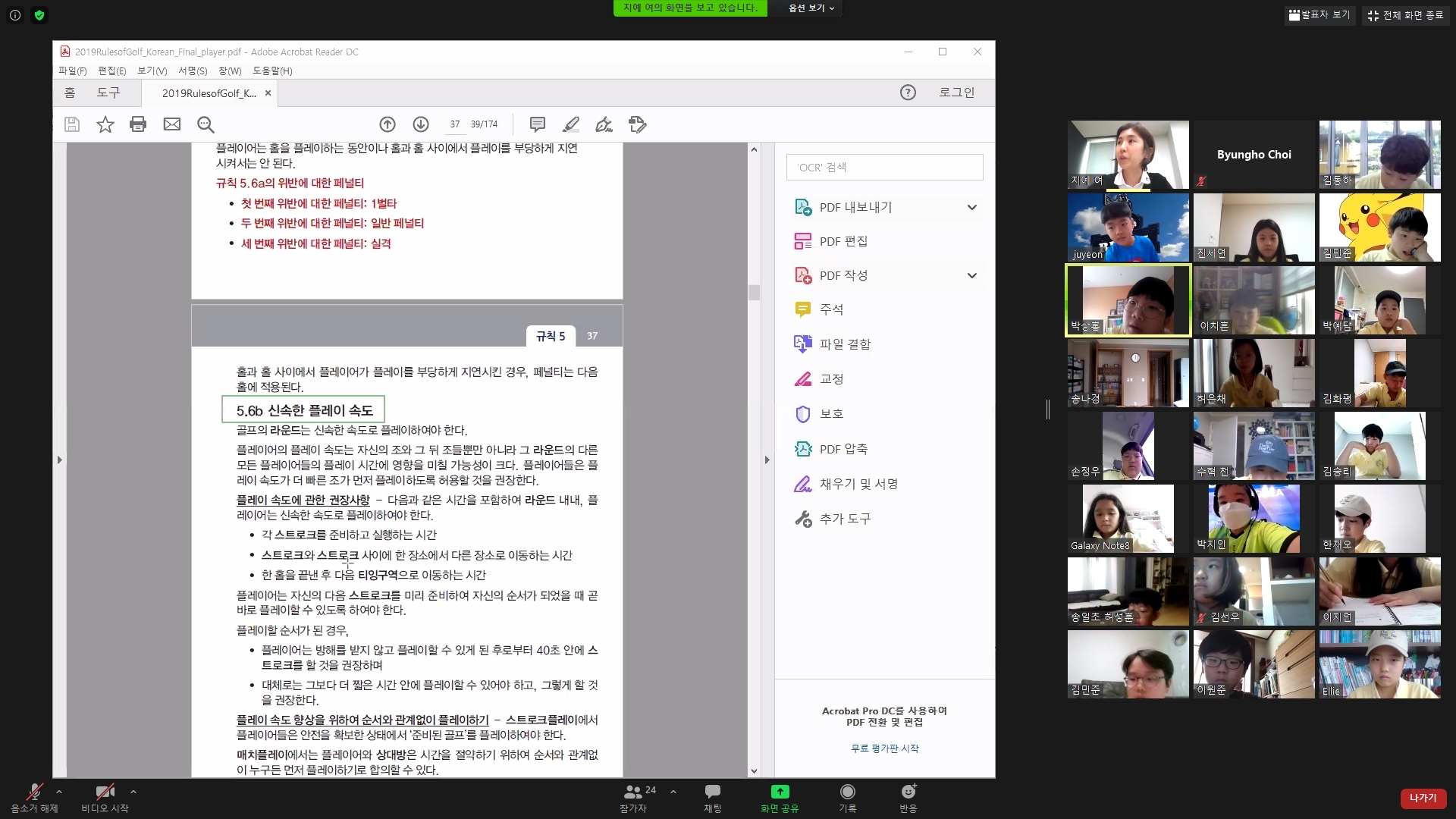 경기속도와 관련된 골프규칙이 있는 조항을 보며 설명을 듣고 있는 모습