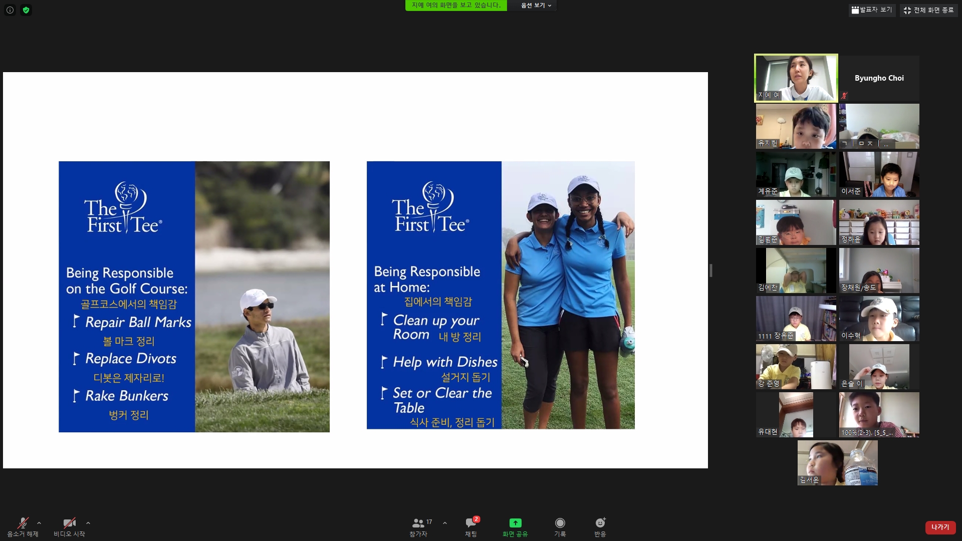 골프코스와 집에서 책임감을 지킬 수 있는 예에 대해서 서로 이야기 나누고 있는 모습