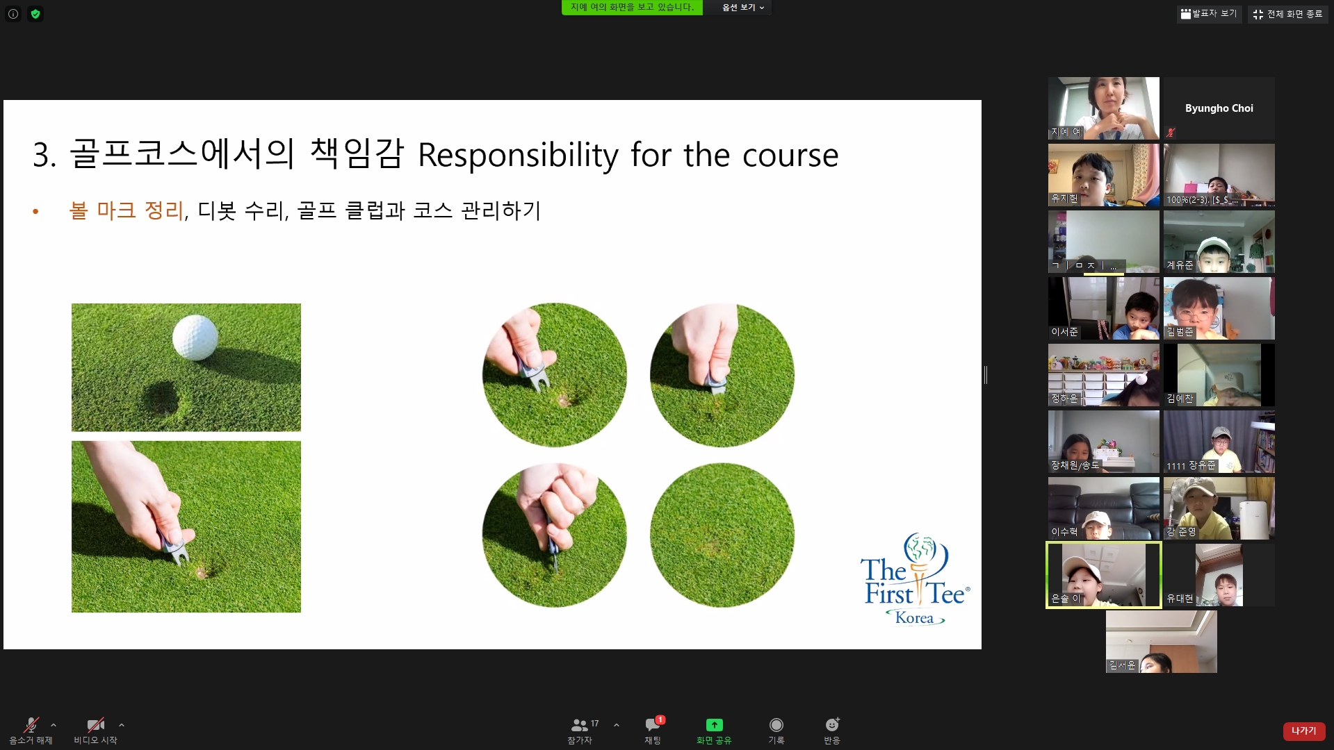 플레이 도중 그린 위에 생긴 디봇에 대해서는 플레이어가 직접 수리해야 한다는 것에 대해 설명해 주고 있는 모습