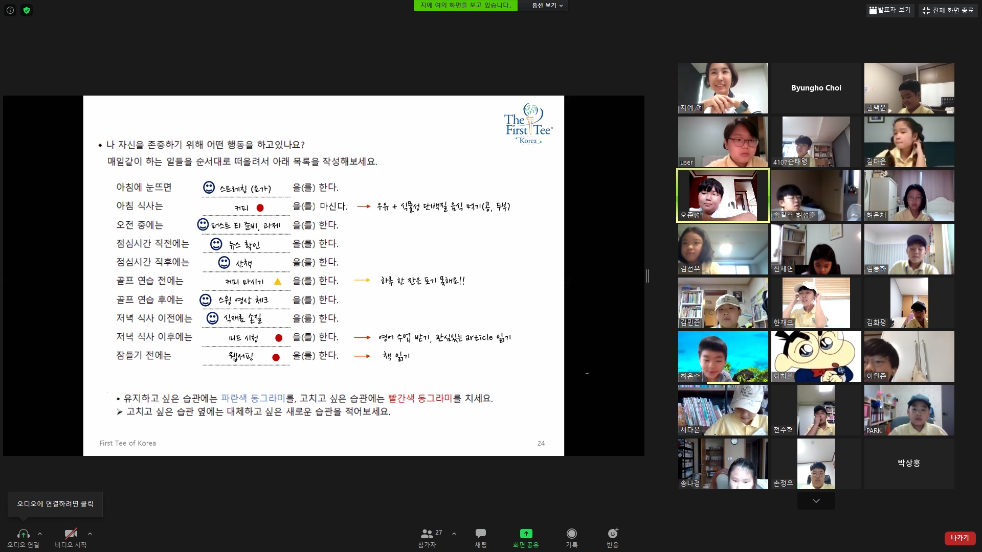유지하고 싶은 습관과 고치고 싶은 습관을 직접 적어보며 자신의 삶을 개선하는 방법에 대해서 설명하는 모습