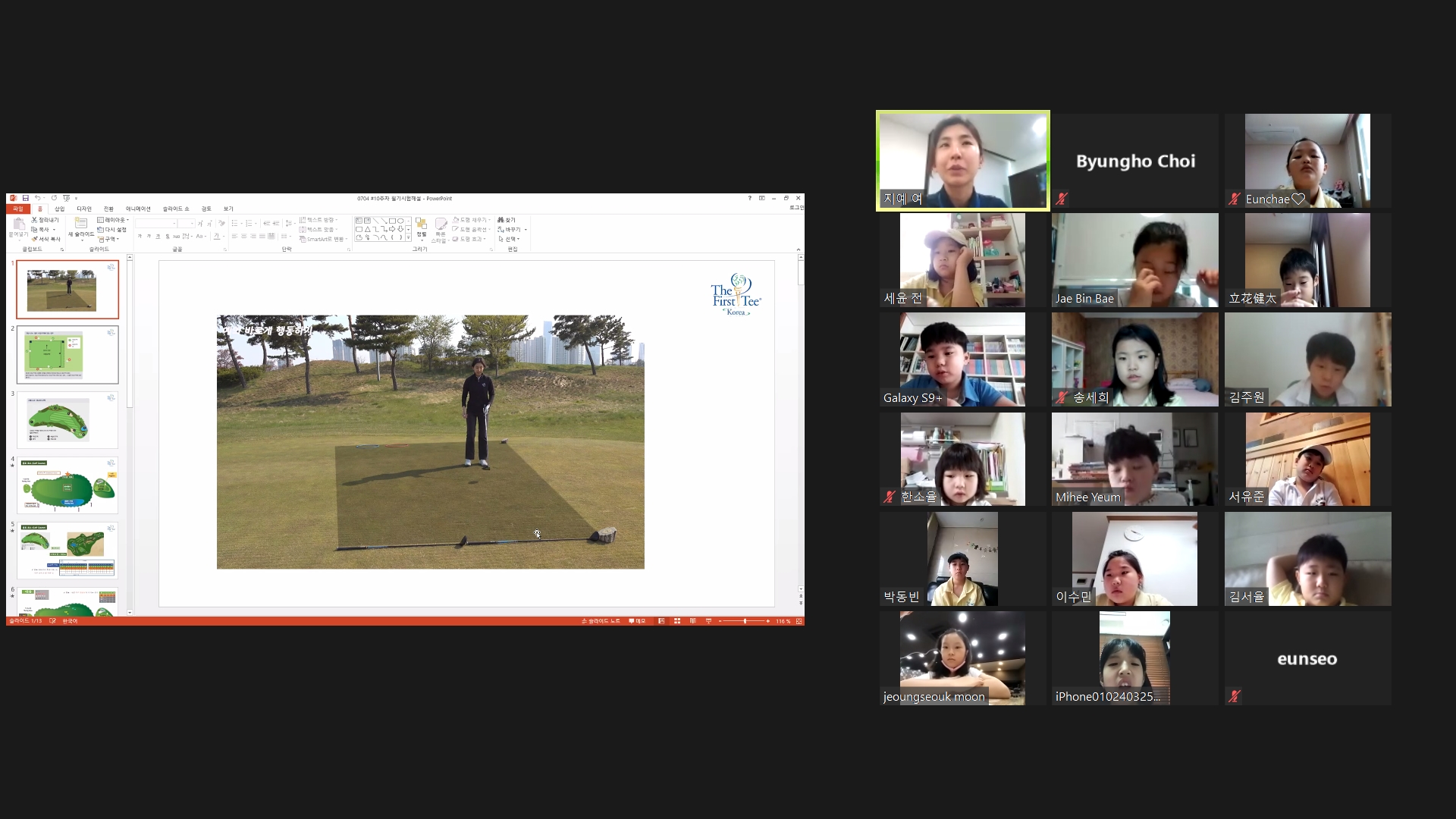 각자 종합평가시험을 본 것에 대해 문제풀이를 하며 티잉그라운드 내 티샷 가능 구역에 대해 설명해주고 있는 모습