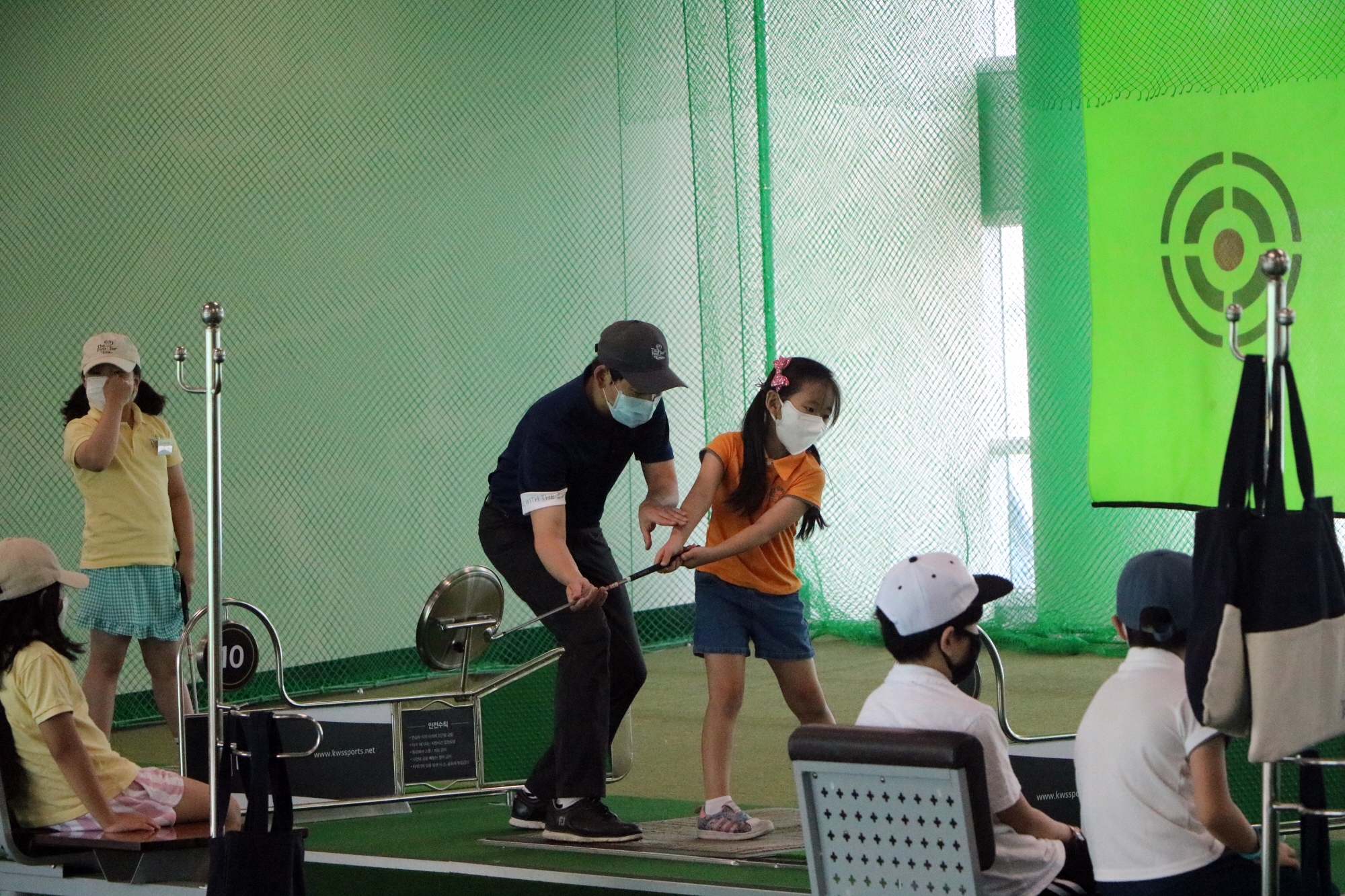 공이 원하는 방향으로 제대로 날아가게 하기 위해서는 백스윙 궤도를 어떻게 해야 하는지 지도해 주는 모습