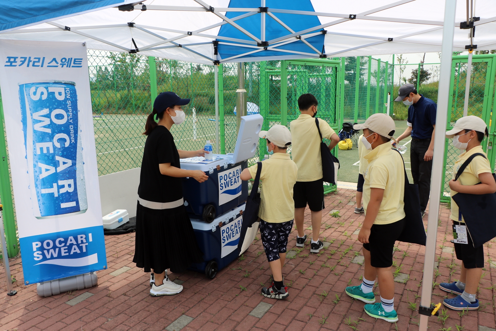 탈수증상 예방과 무더위를 식히게 해주기 위해 스포츠 이온음료를 지급하고 있는 모습