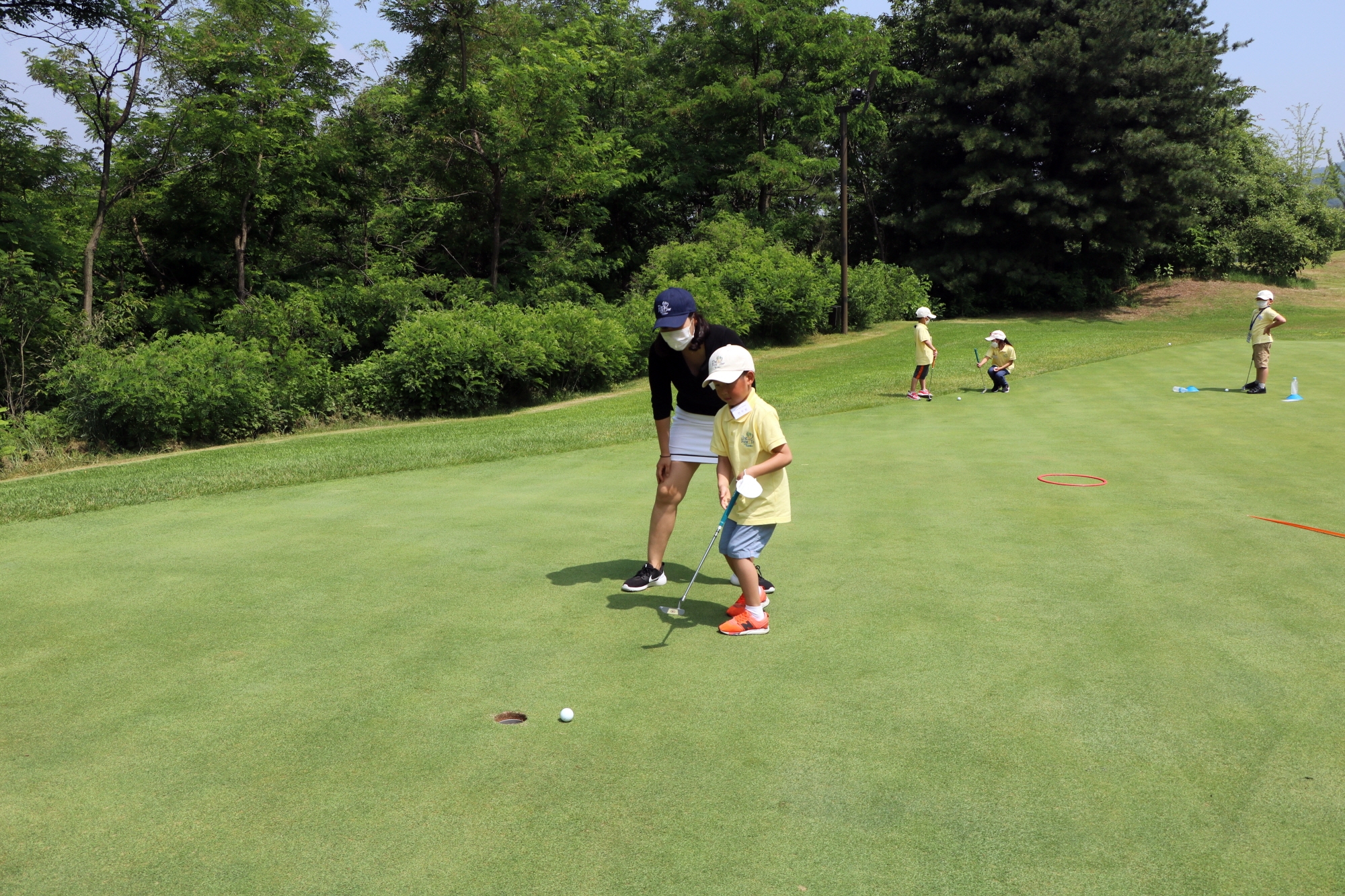 코치님의 밀착레슨에도 불구하고 공이 목표방향에 살짝 비켜가자 아쉬워하는 모습