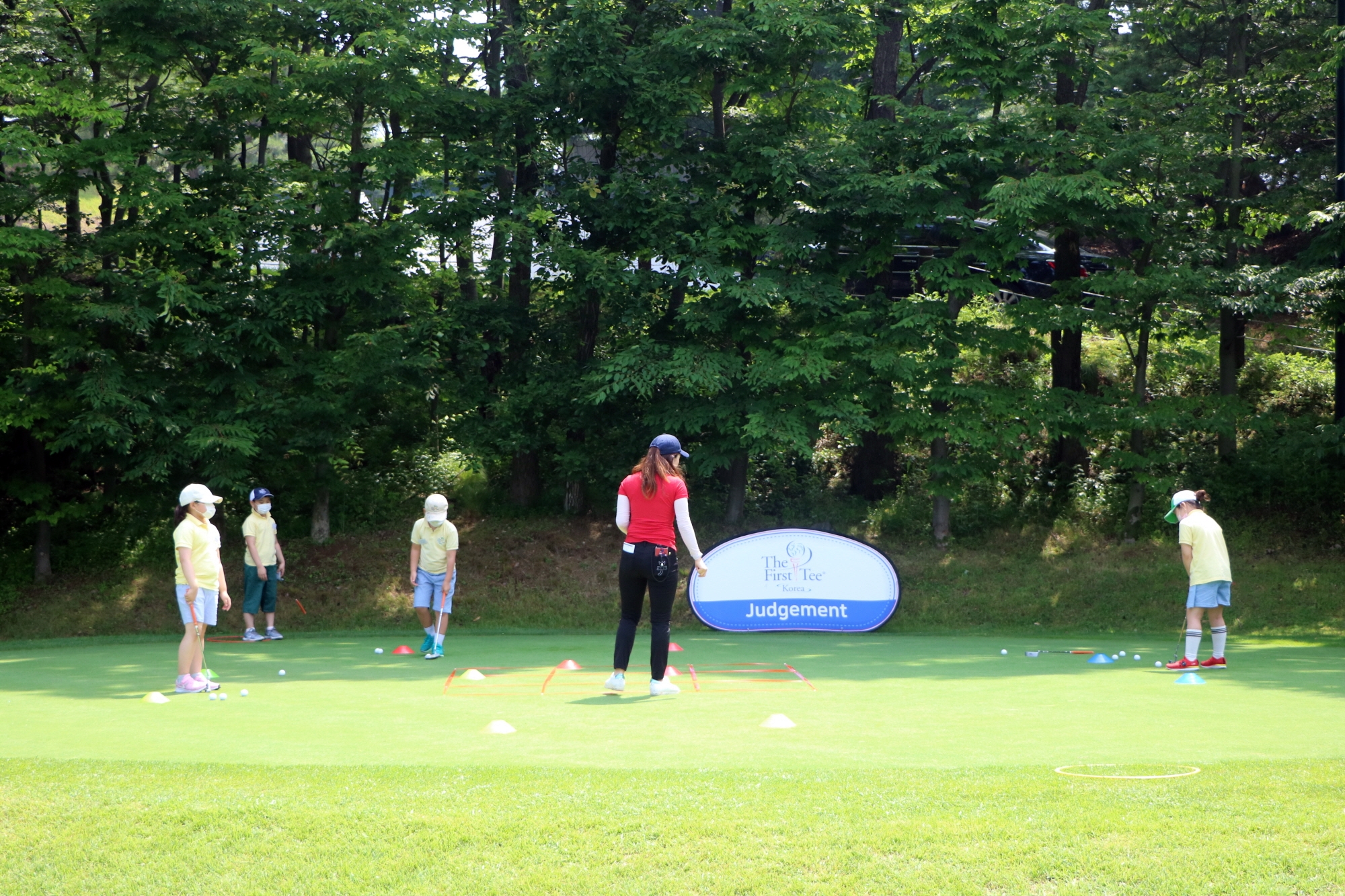 코치님과 함께 시간 가는 줄 모르고 즐겁게 퍼팅게임을 하고 있는 아이들
