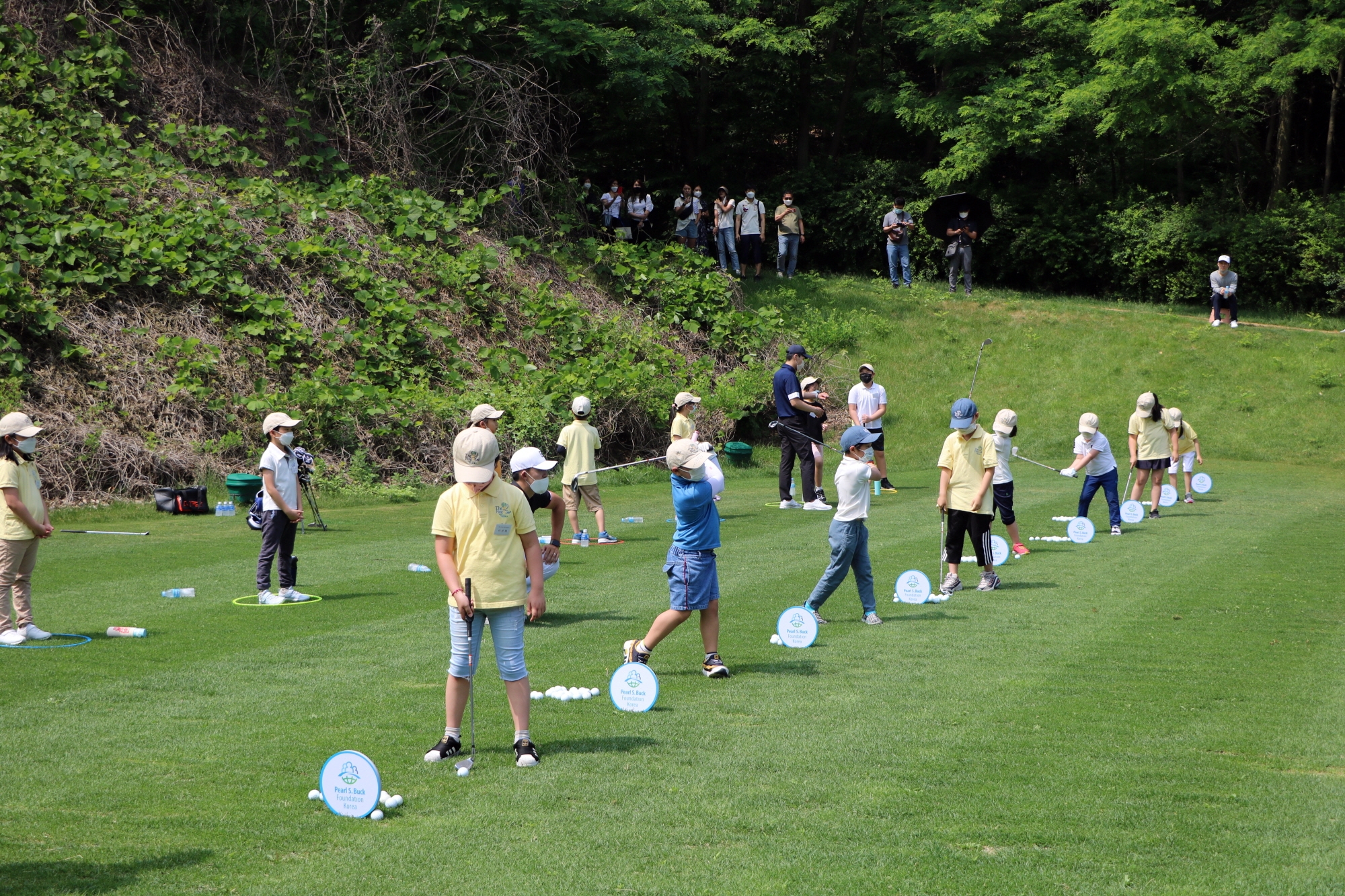 코치님들의 지도에 따라 풀스윙 실습을 하고 있는 아이들