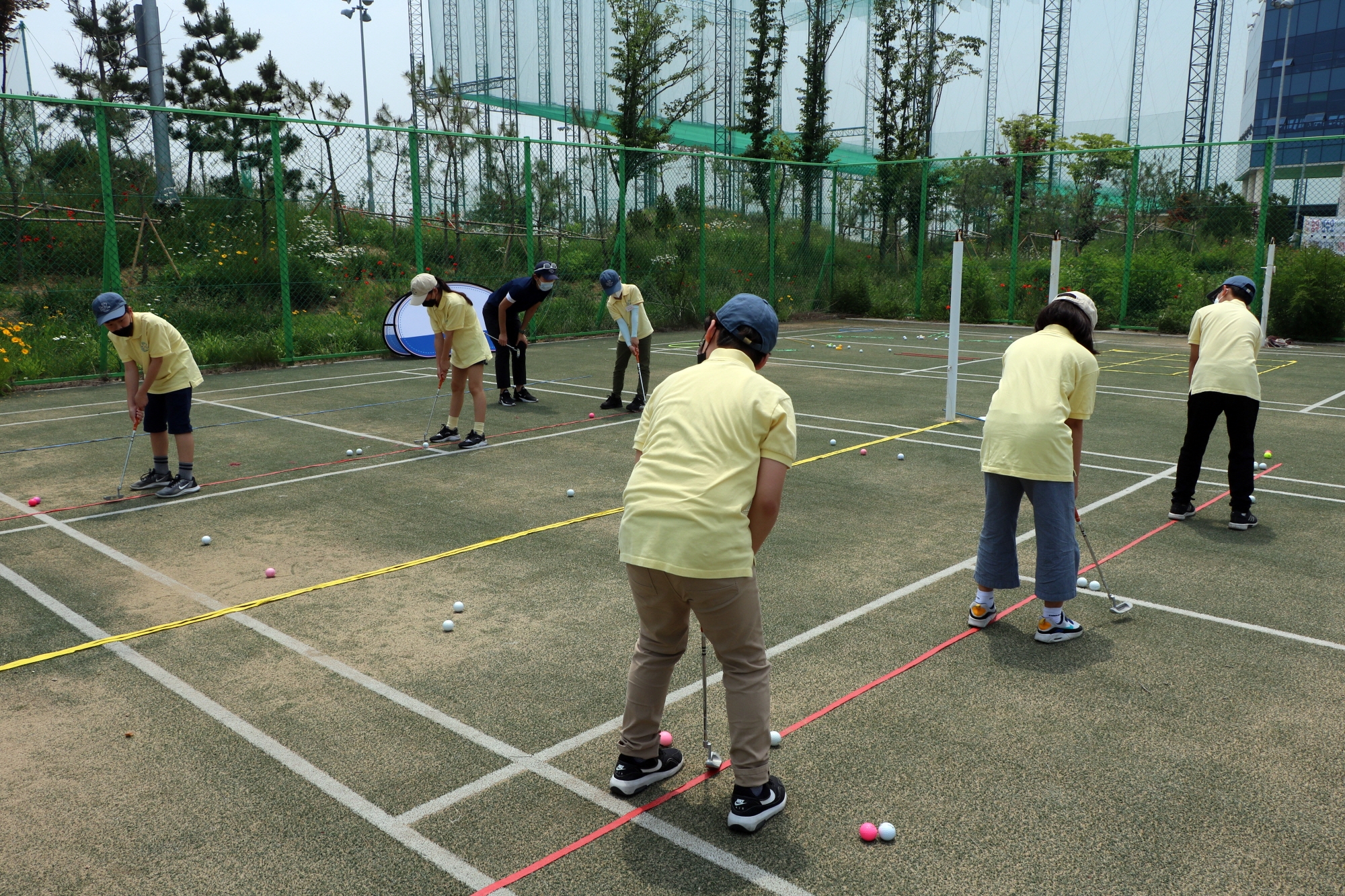 거리를 달리한 목표선을 향해 퍼팅 실습을 하고 있는 아이들