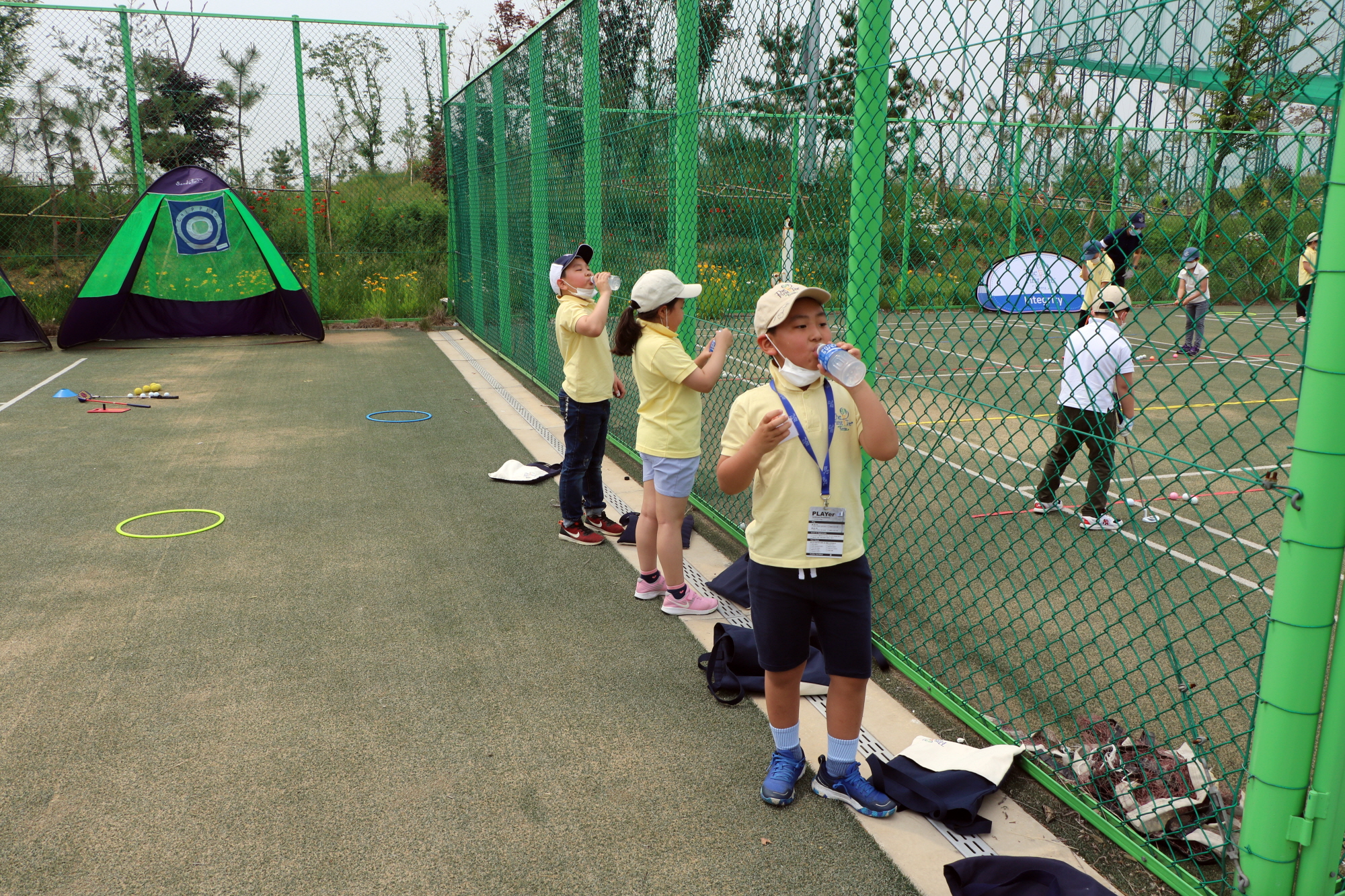 건강한 생활습관을 위해 교육 중간 중간 생수 또는 스포츠 이온음료를 마시며 수분을 보충하고 있는 아이들