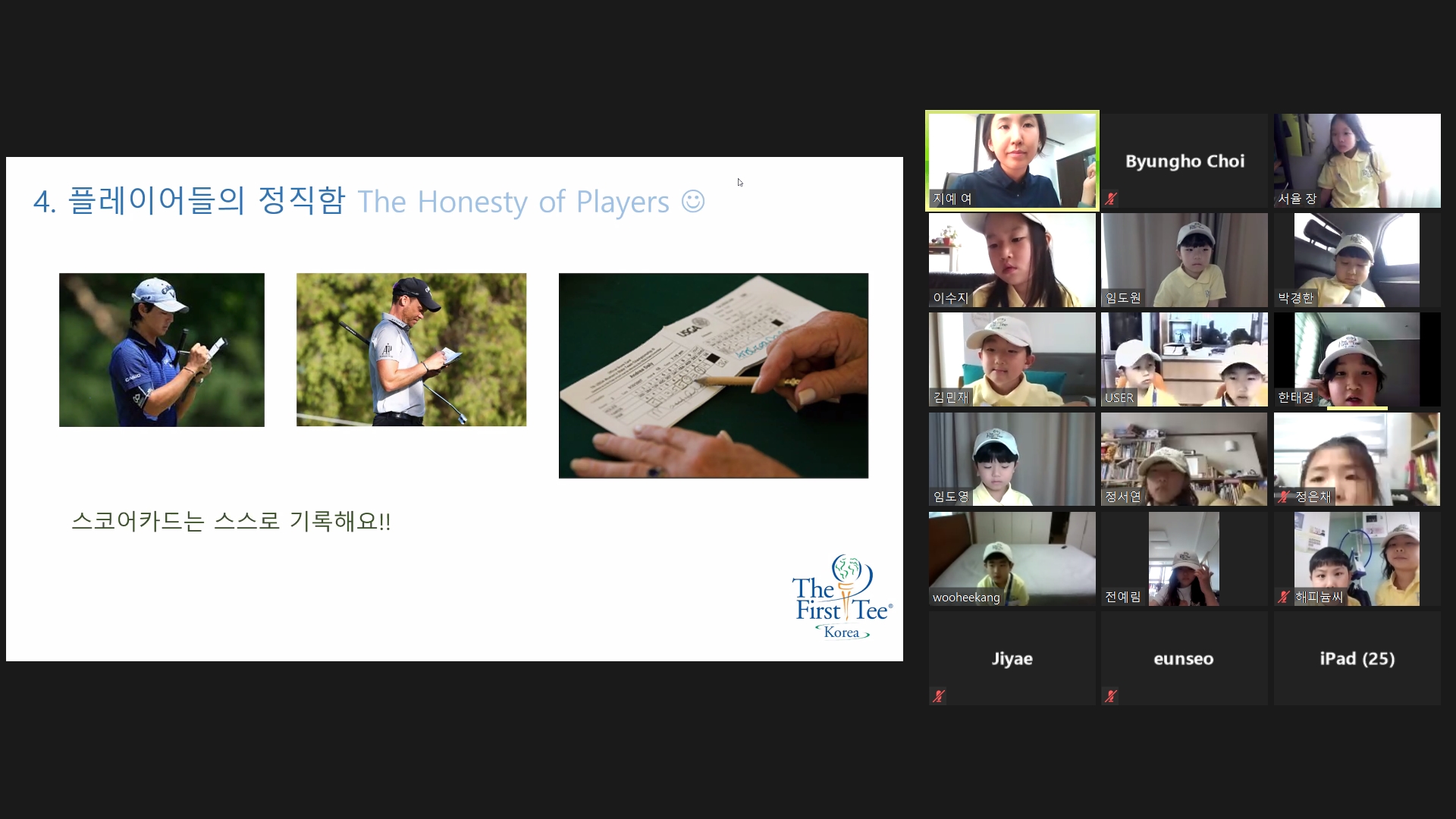 골프경기를 할 때 본인이 직접 자신의 스코어를 적어야 한다는 것에 대해 설명해 주고 있는 모습