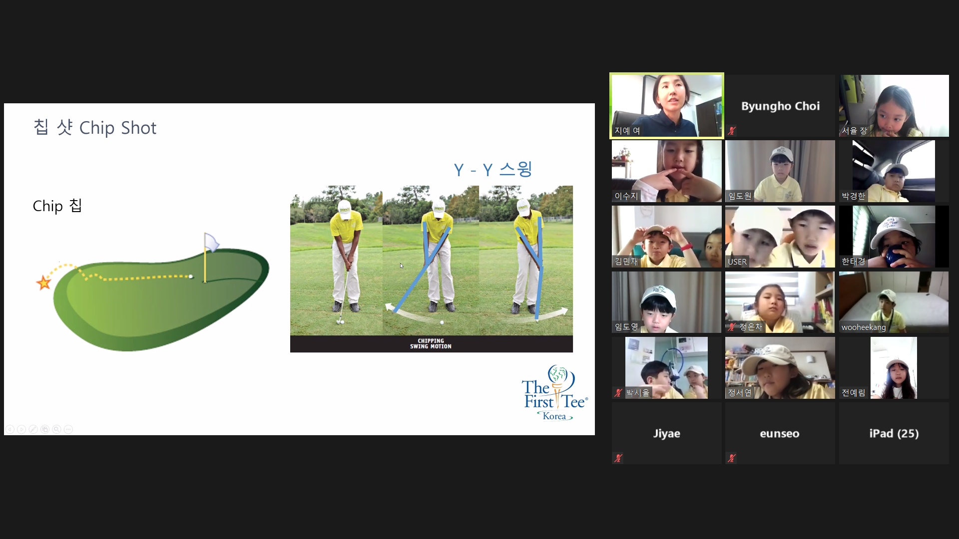 그린 주변에서 홀에 공을 갖다 붙이기 위해 하는 칩샷에 대해서 설명해 주고 있는 모습