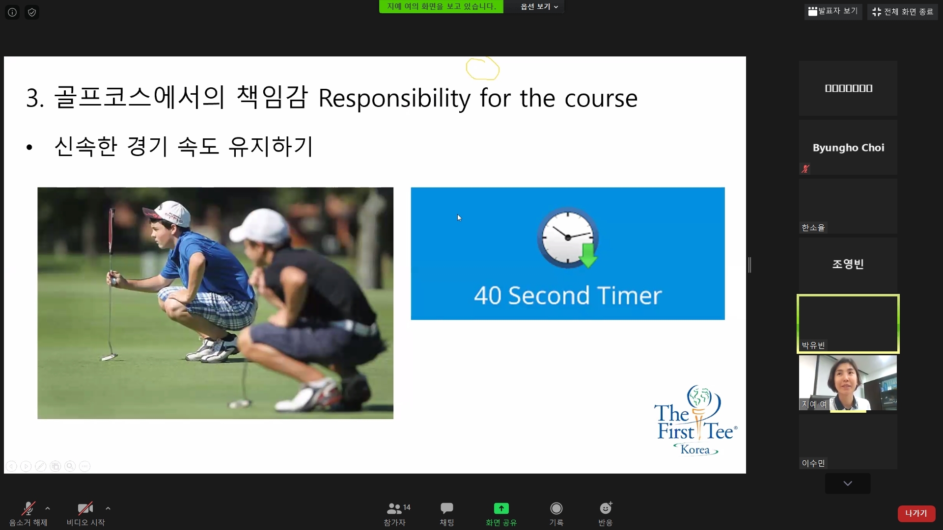 코스에서 책임감을 지키기 위해 신속하게 플레이 해야 한다는 내용에 대해서 설명해 주고 있는 모습