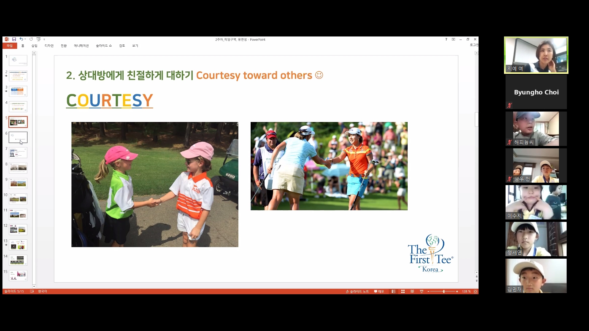 골프경기를 할 때 예의를 지키는 사례 중 하나로 서로 악수하고 경기를 시작해야 하는 것을 설명하는 모습