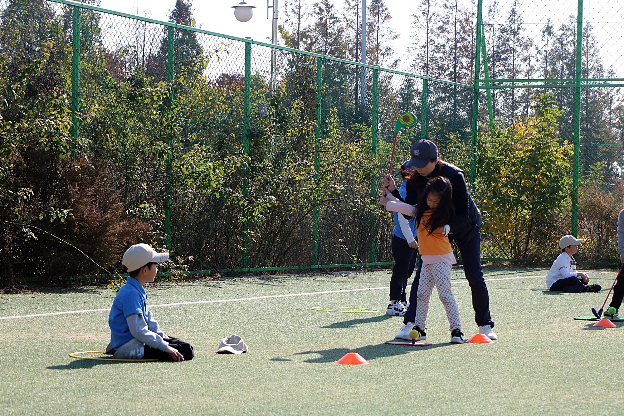 아이들이 처음부터 정확한 스윙 동작을 구사할 수 있도록 1:1로 철저하게 레슨하고 있는 모습