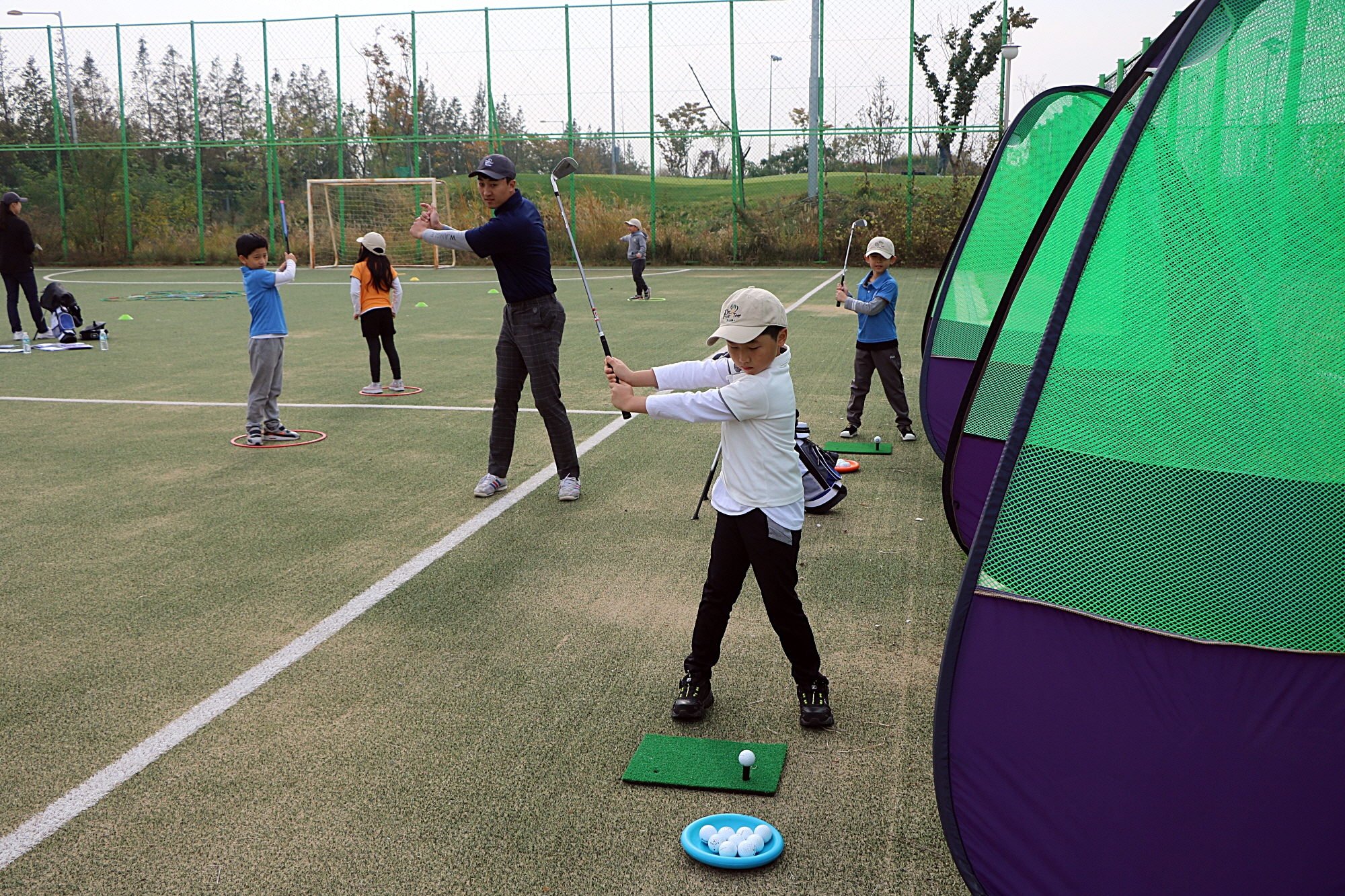 실제 골프공과 클럽을 가지고 L TO L 스윙 동작을 실습하고 있는 아이들