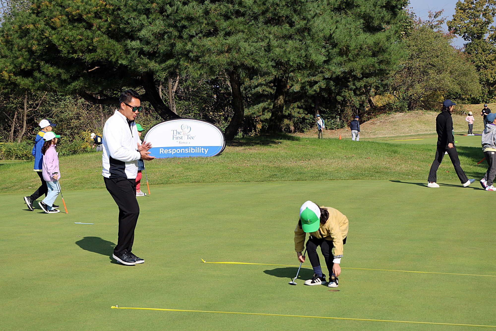 홀인에 성공한 교육생에게 박수를 치며 축하해 주고 있는 남영우 프로