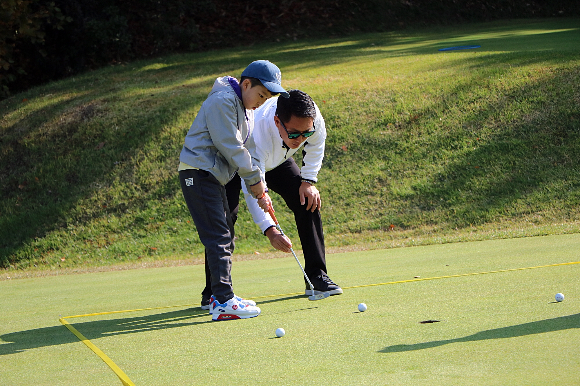 퍼터헤드의 페이스 면이 목표방향과 수직이 되게 퍼터헤드 방향을 교정해 주고 있는 모습