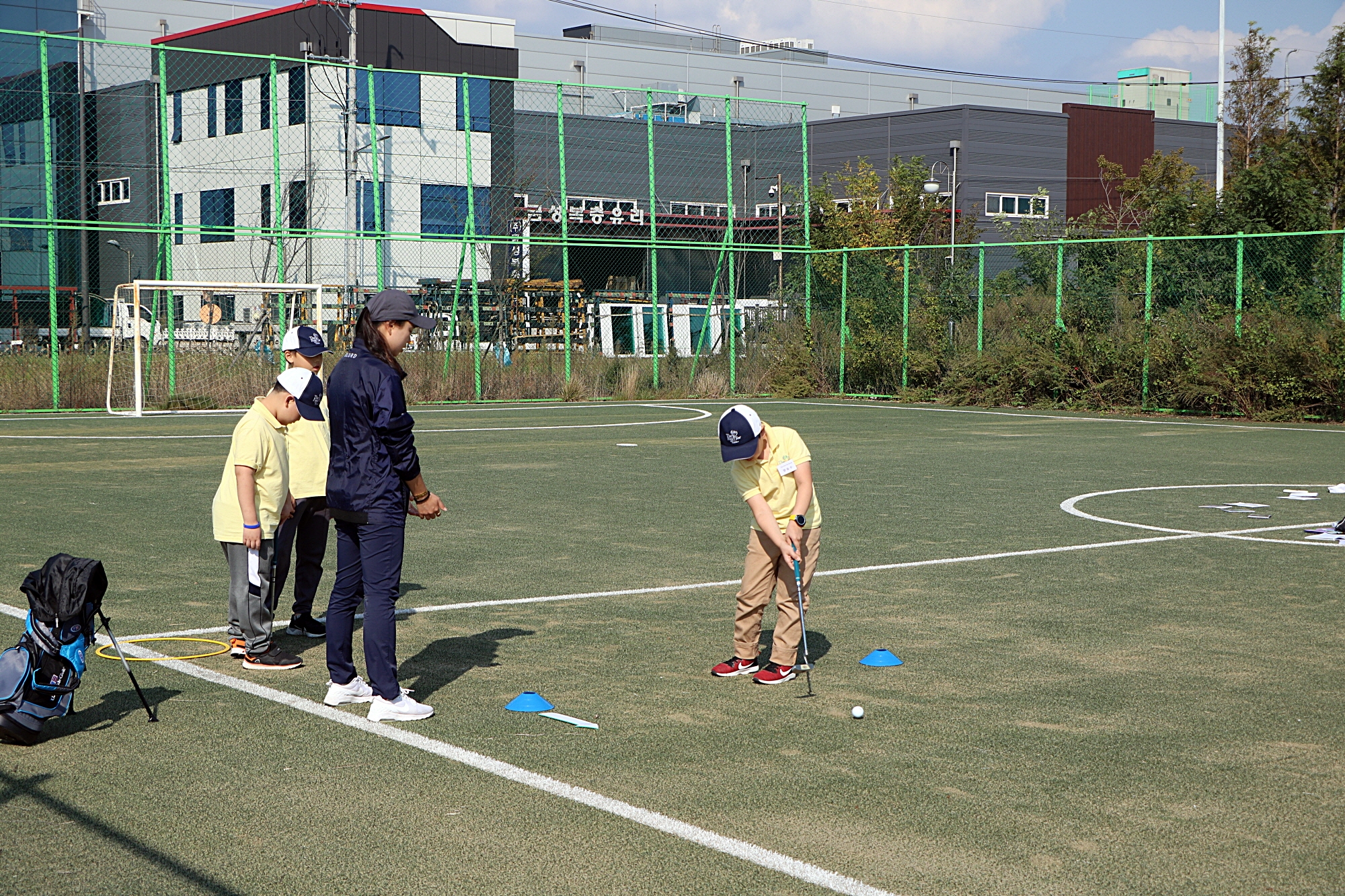 코치님이 지켜보는 가운데 배운대로 신중하게 퍼팅하고 있는 모습