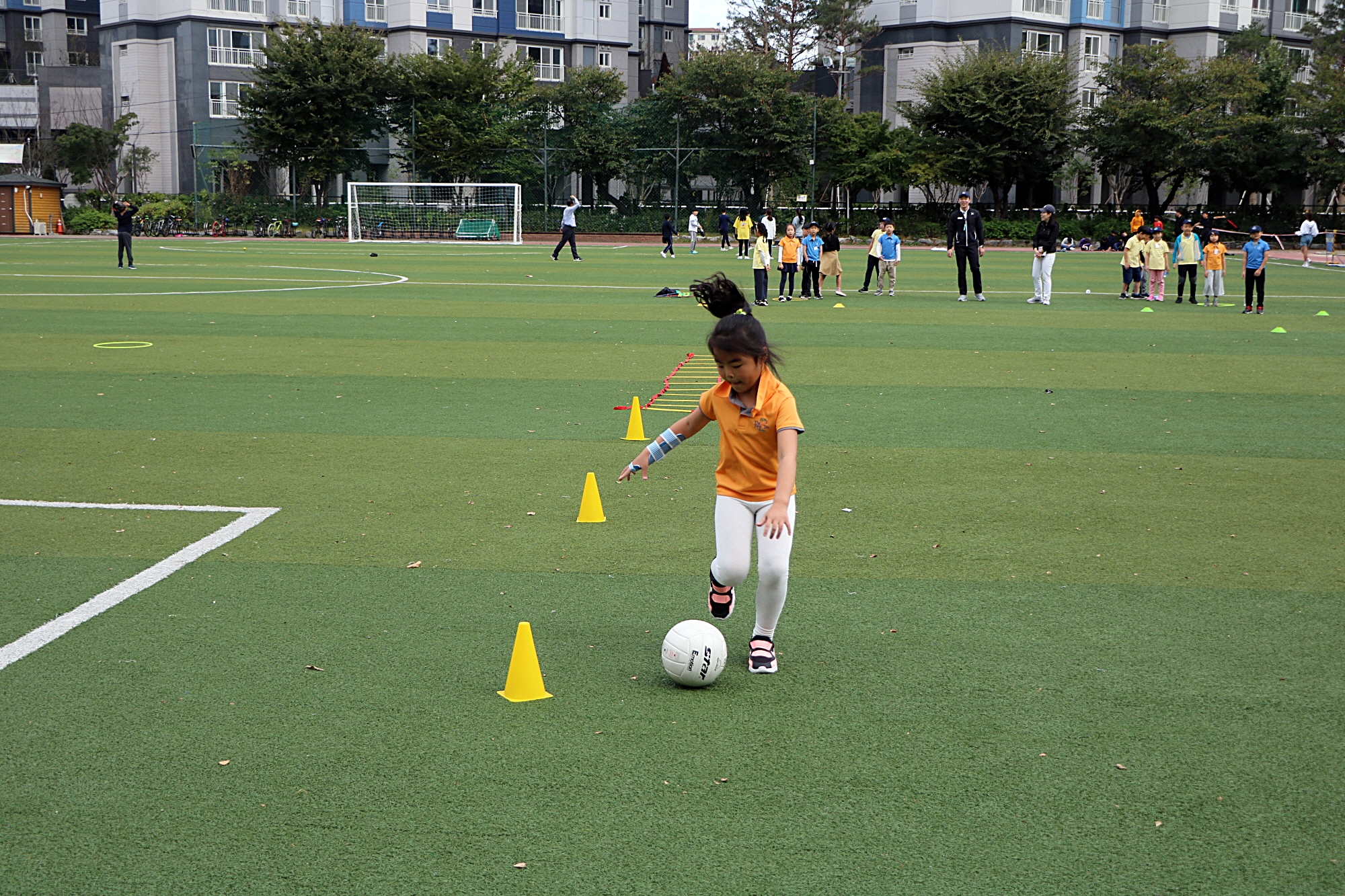 드리볼을 하면서 장애물을 통과하고 있는 아이들