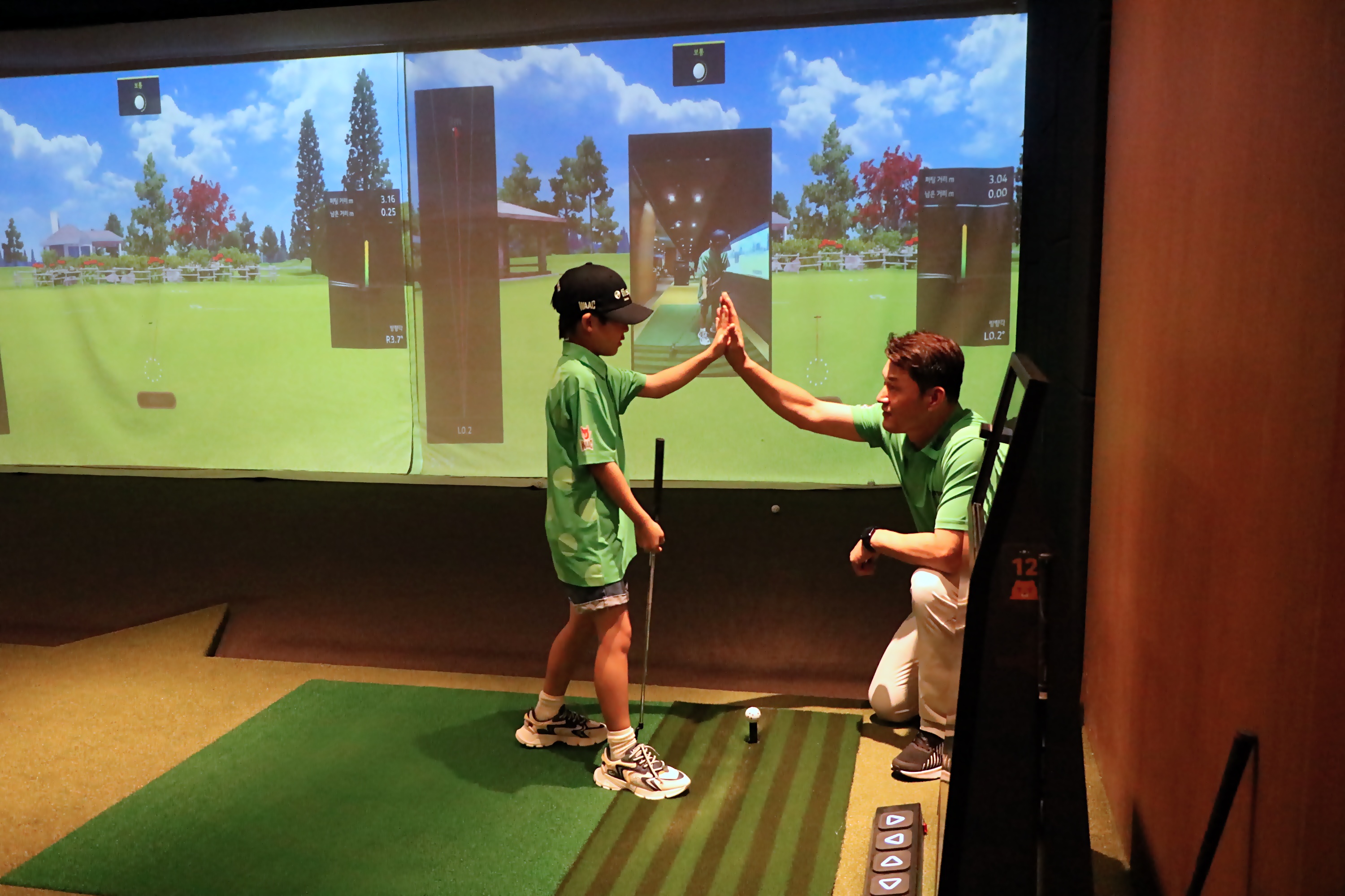 퍼팅 실습에서 홀인에 성공한 뒤 코치님과 하이파이브를 하는 모습