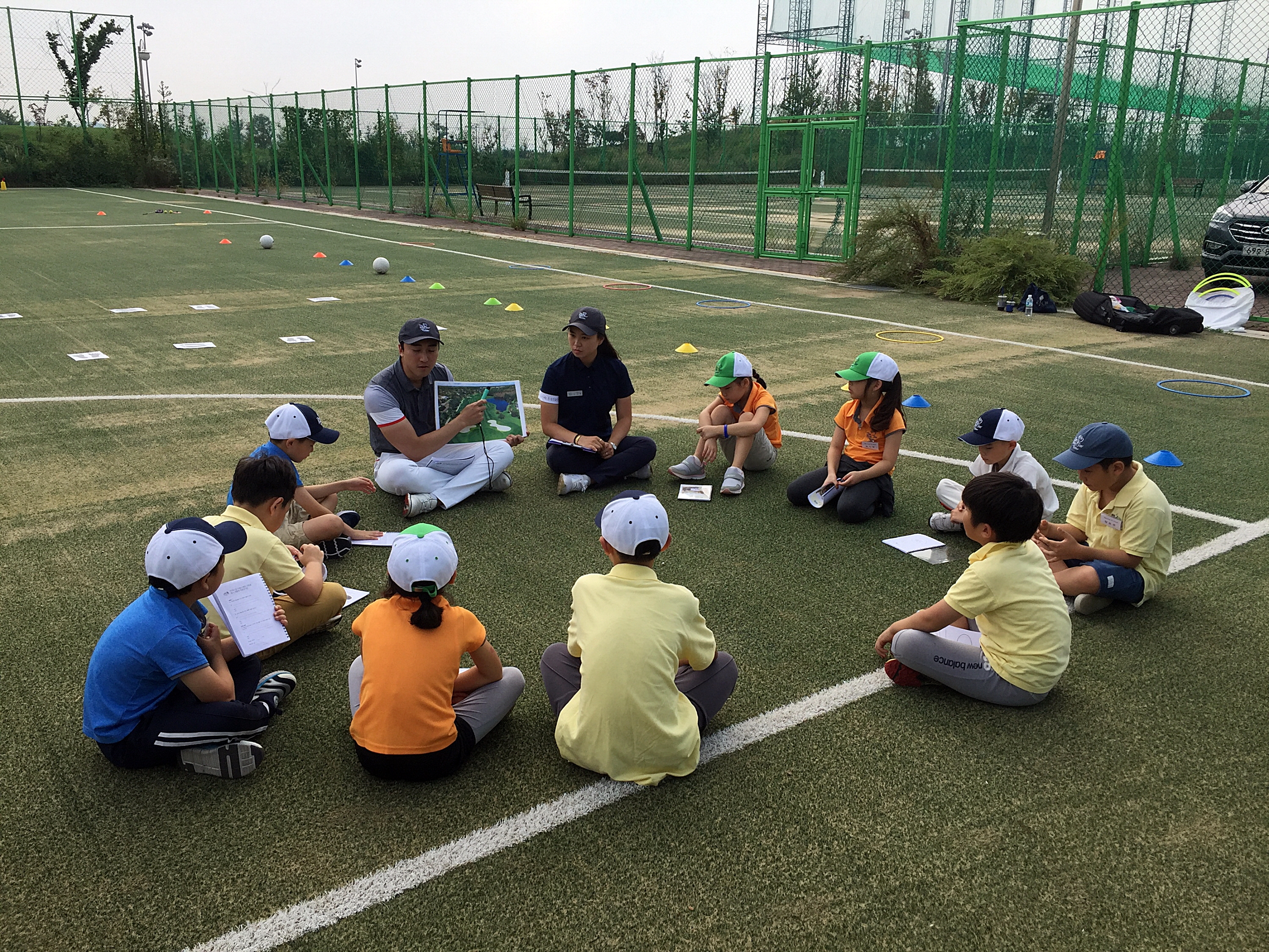 현역 KPGA 프로 출신의 코치님이 코스명칭에 대해 설명해 주고 있는 모습