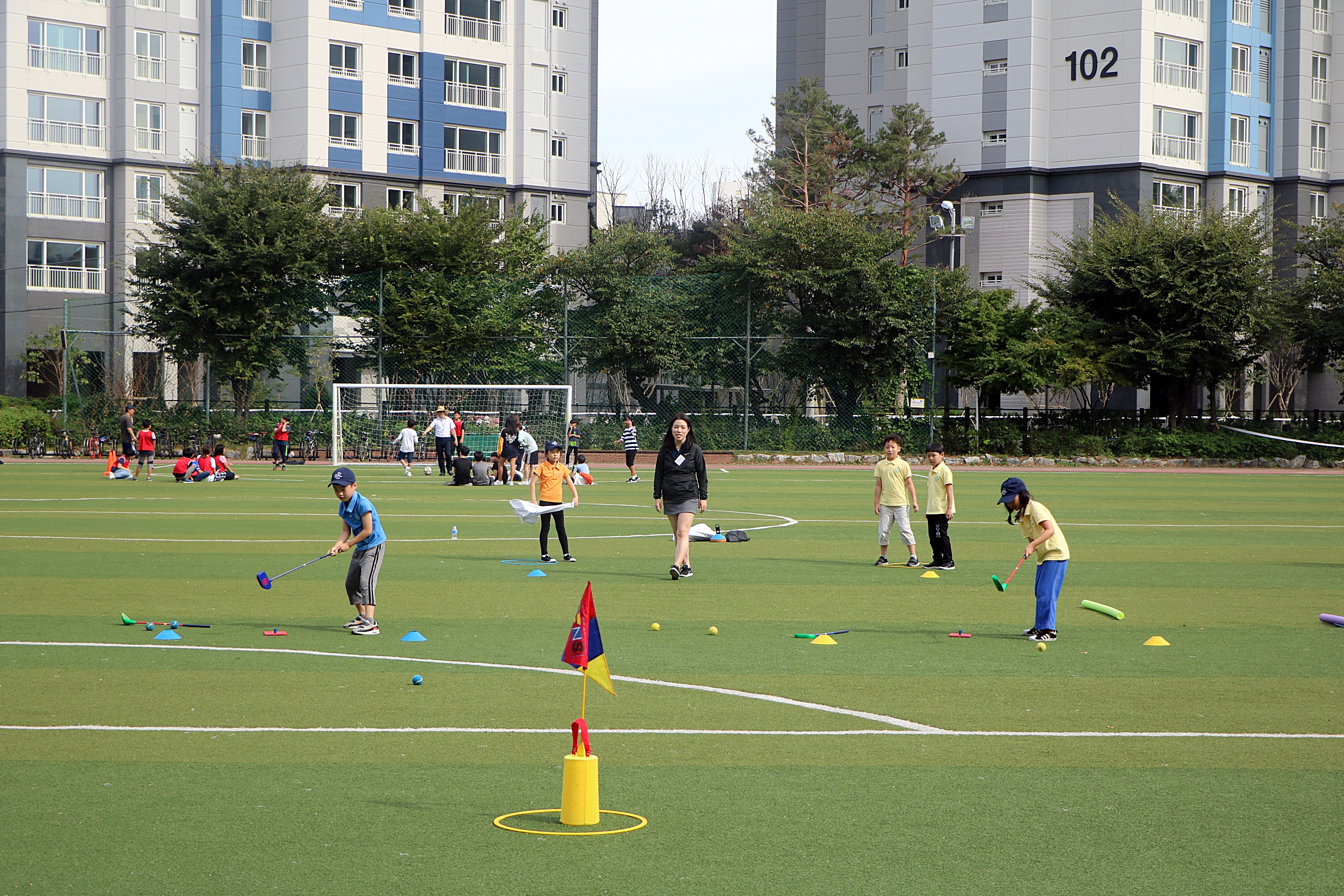 팀대항전으로 양팀으로 나뉘어 골프게임을 하고 있는 모습