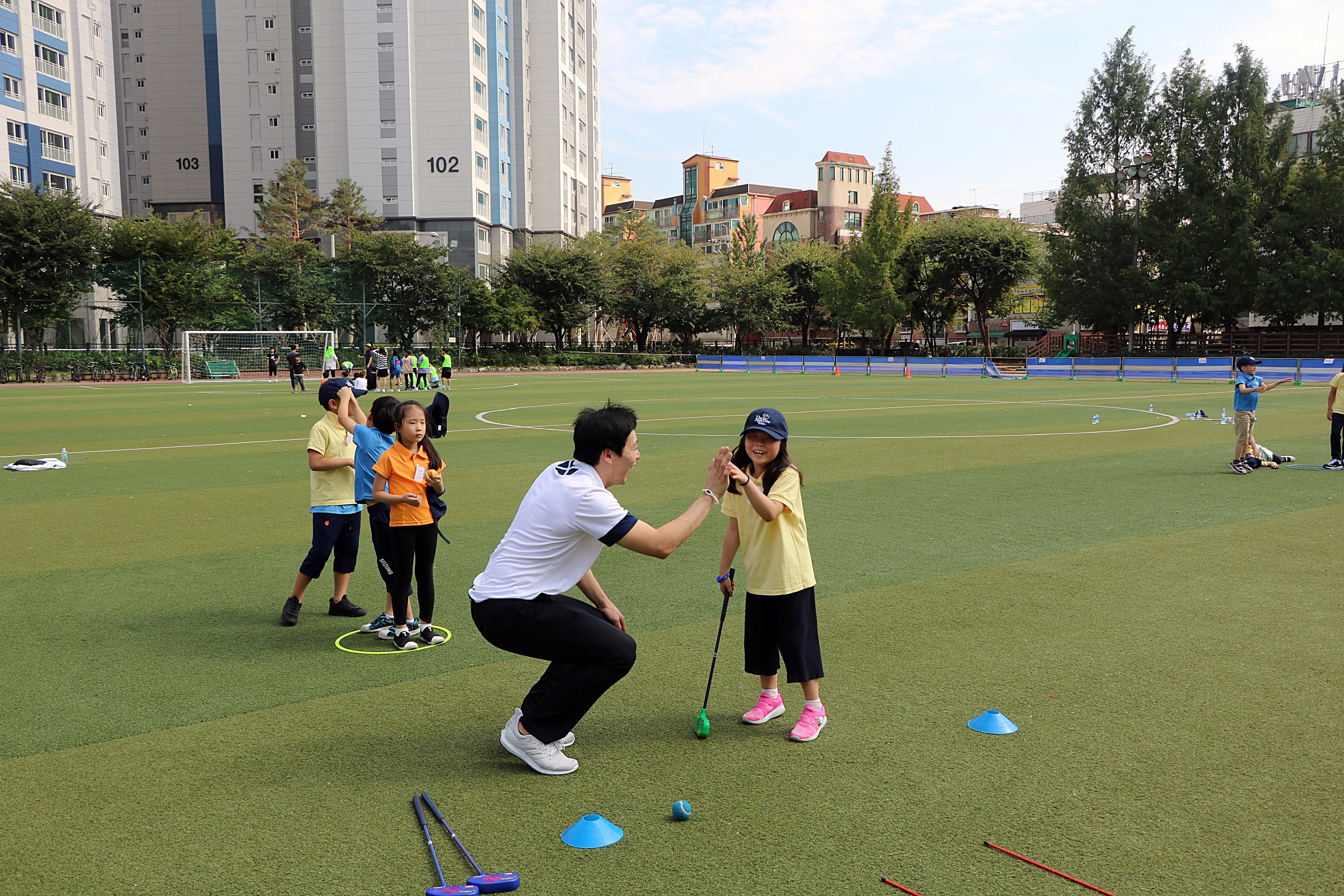 퍼팅에 성공한 뒤 코치님과 하이파이브를 하고 있는 모습
