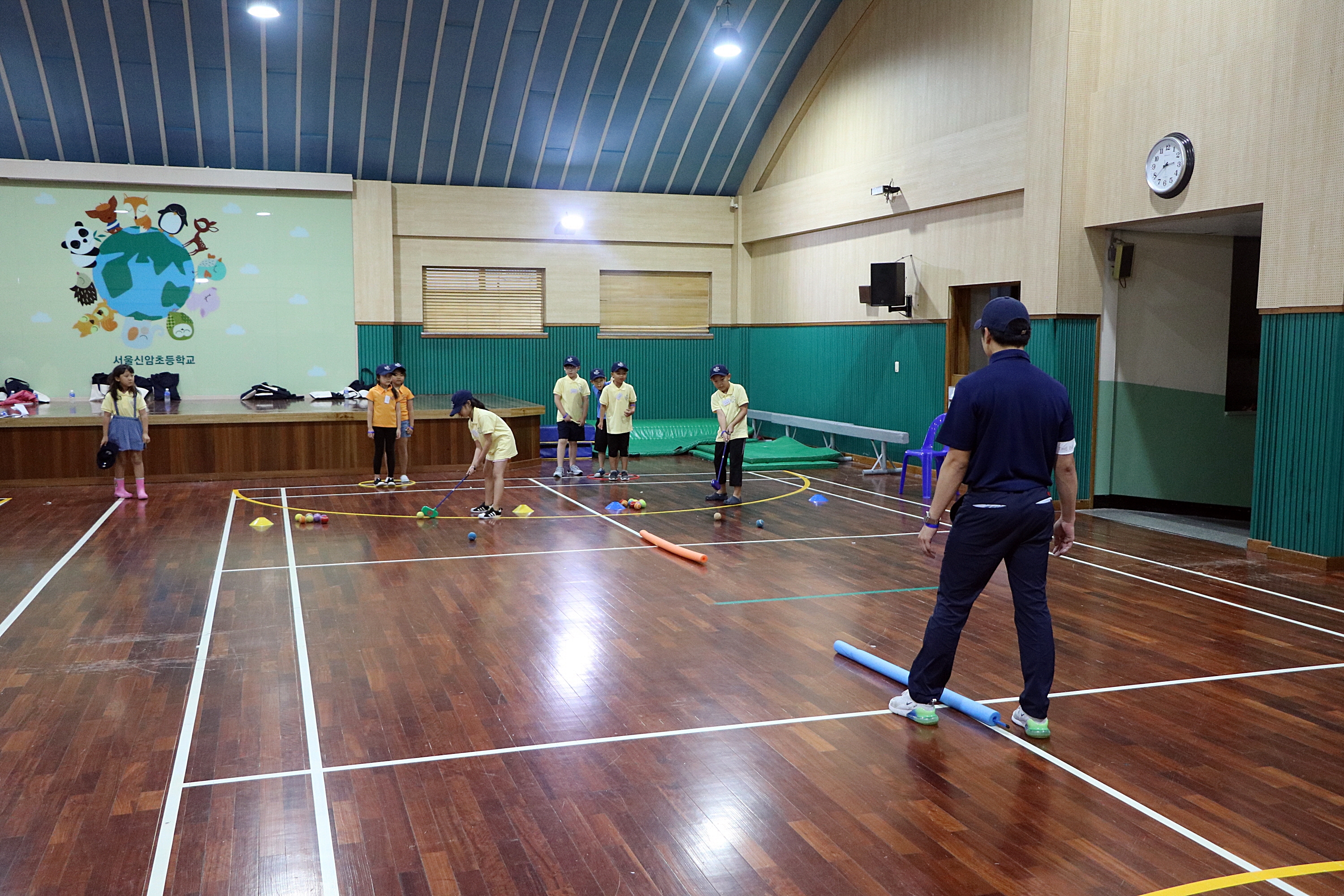코치님이 서계신 곳까지 볼을 보내야 하는 퍼팅게임을 하며 즐거워 하고 있는 아이들 모습_거리감에 대한 개념을 알려주기 위한 게임