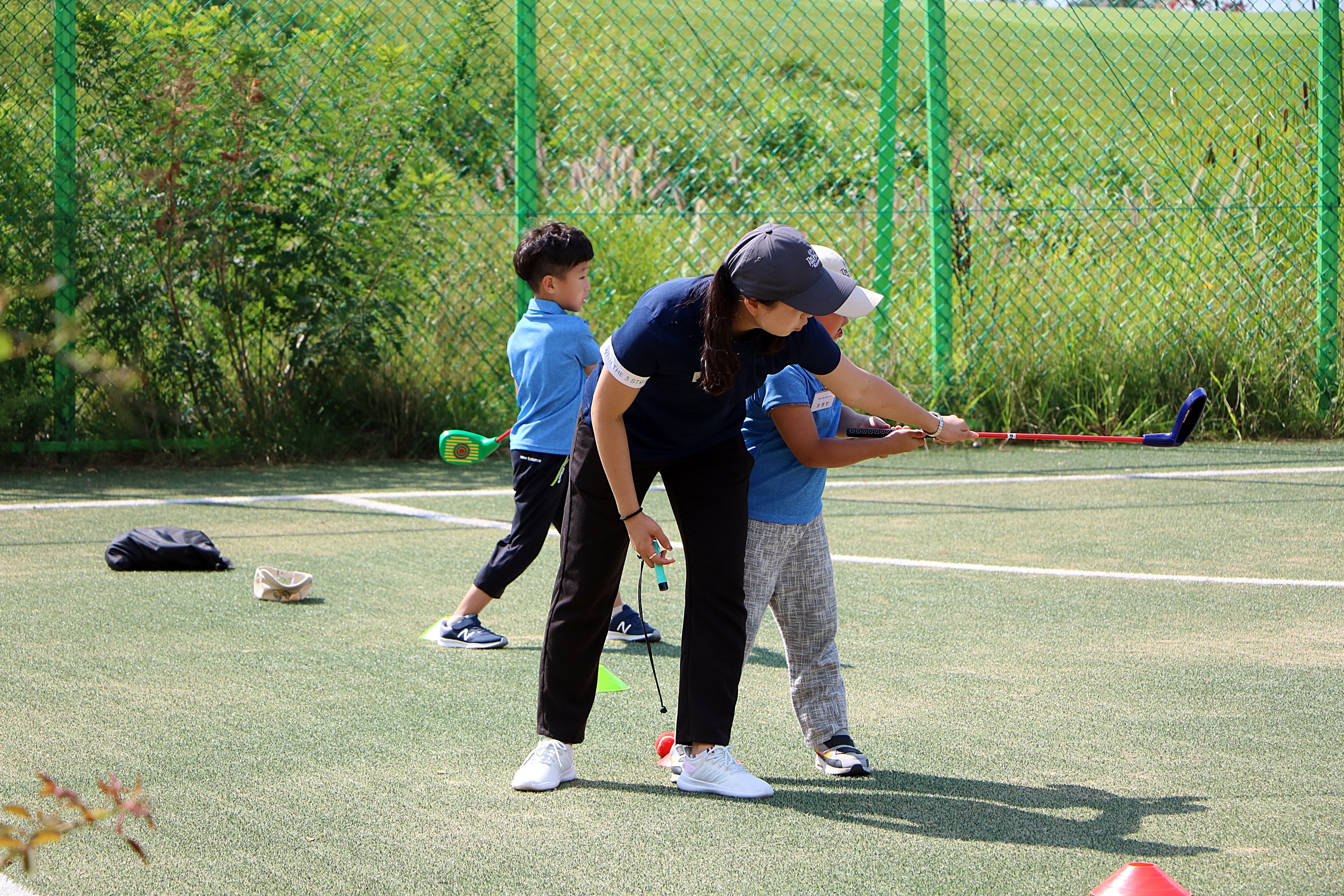 칩샷하는 요령에 대해서 1:1 레슨을 해주고 있는 모습